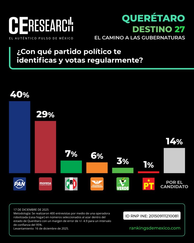 Este liderazgo interno se refleja también en el panorama general. El PAN se mantiene como la fuerza política con mayor identificación entre el electorado al concentrar 40% de las preferencias partidistas, frente al 29% que obutvo MORENA.