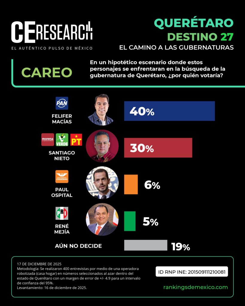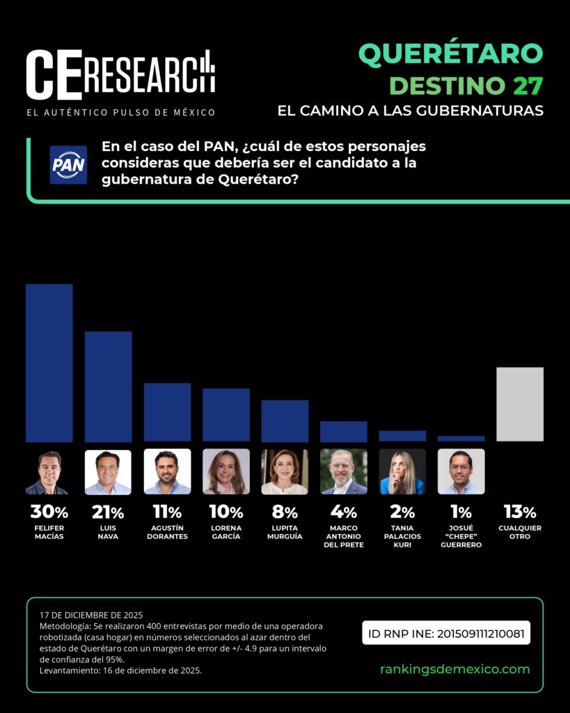 La distancia entre Felifer Macías y Luis Nava se amplía por 11 puntos porcentuales, aunque ambos se mantienen como los aspirantes más adelantados entre los perfiles del PAN que buscarán la gubernatura de Querétaro en 2027, de acuerdo con la encuesta “Destino 27”, elaborada por CE Research.