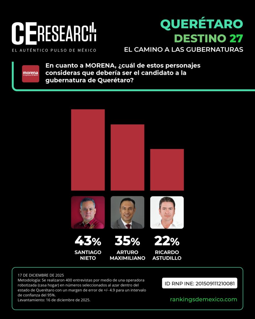 En el bloque de MORENA, Santiago Nieto se mantiene como el aspirante más aventajado al registrar 43% de respaldo. No obstante, Arturo Maximiliano alcanza 35% y Ricardo Astudillo 22%, mostrando una competencia interna más cerrada en comparación con el PAN.