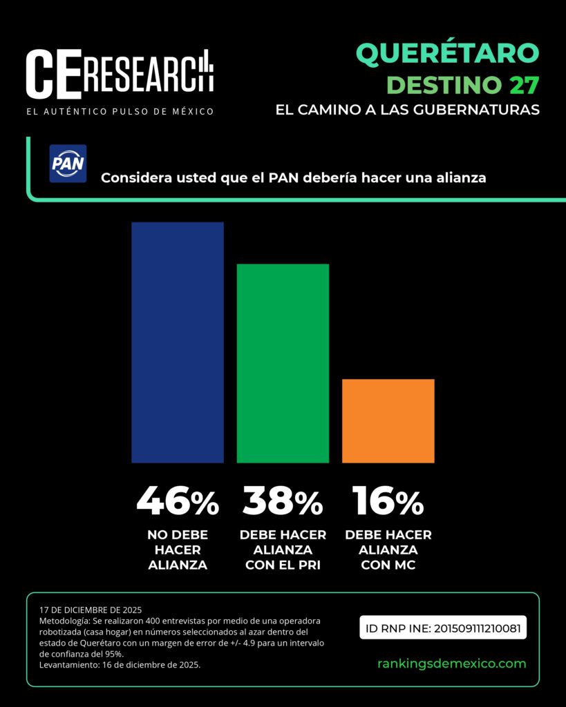 Respecto a la estrategia electoral del PAN, el 46% considera que el partido no debe hacer alianza, mientras que 38% opina que debería hacerlo con el PRI y 16% con Movimiento Ciudadano.