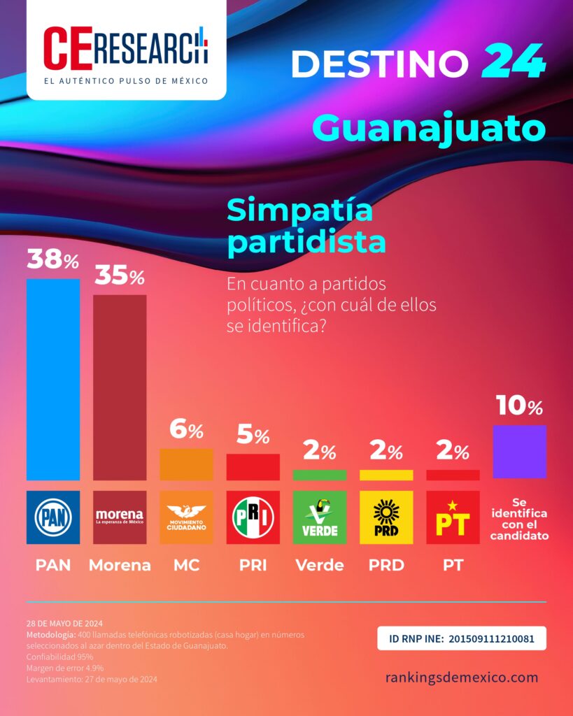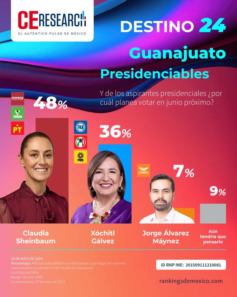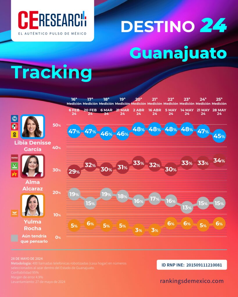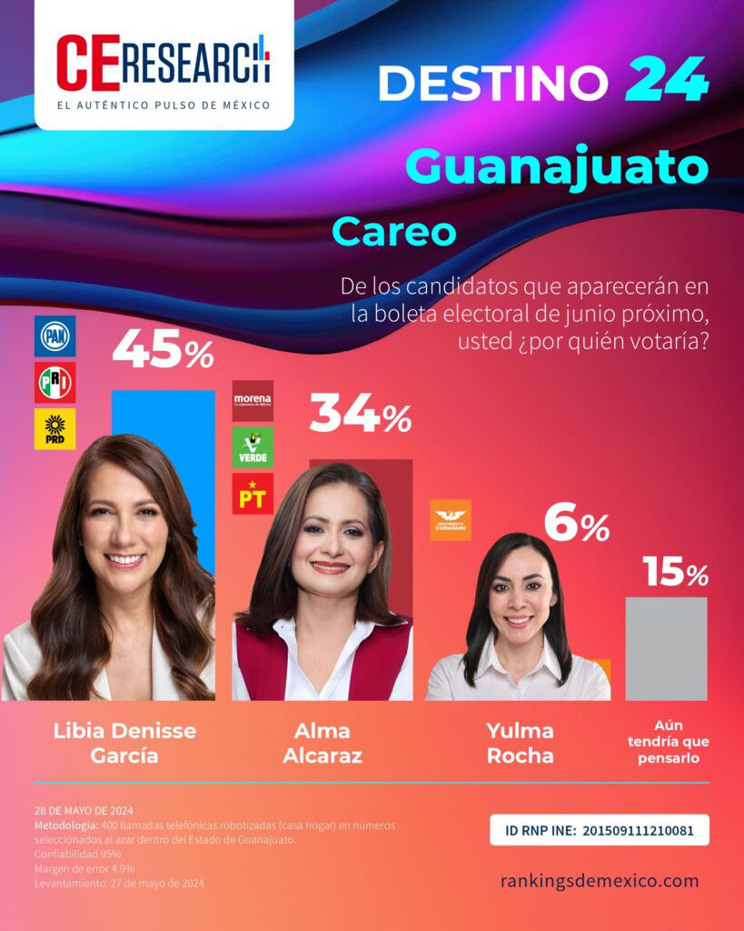 CE Research. 28 de mayo 2024.- Libia García, de la alianza, terminó puntera en la contienda a la gubernatura por Guanajuato pese a una candidata morenista que no cesó en su empeño y se mantuvo competitiva gracias a la marca y llamados presidenciales. 11 puntos tiene de diferencia a favor la candidato de la alianza.