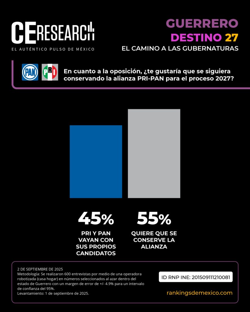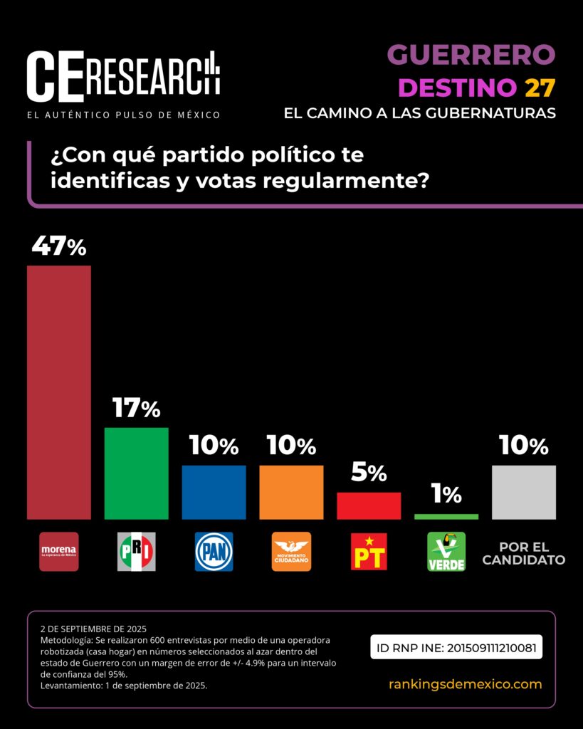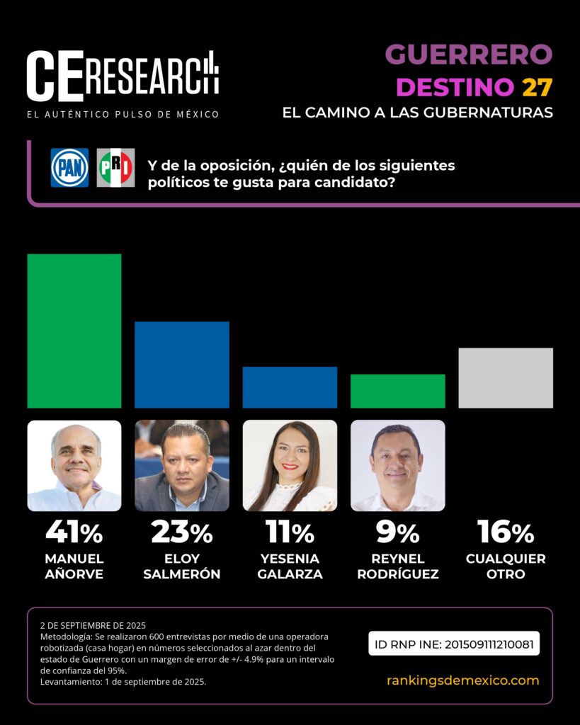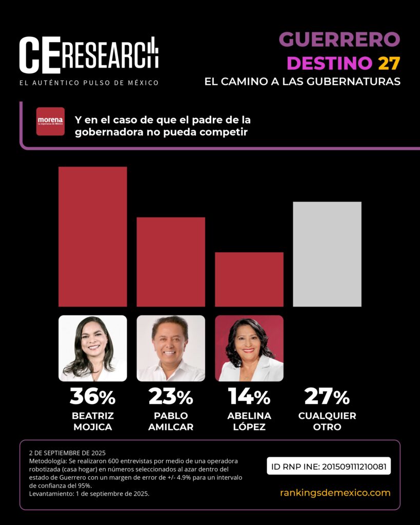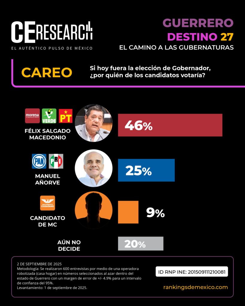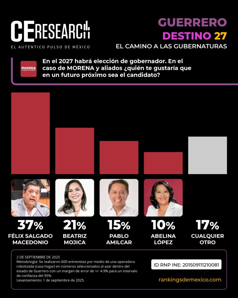 CE Research. 02 de septiembre 2025.- La carrera rumbo a las 17 gubernaturas que se desarrollarán en México en 2027 continúa.