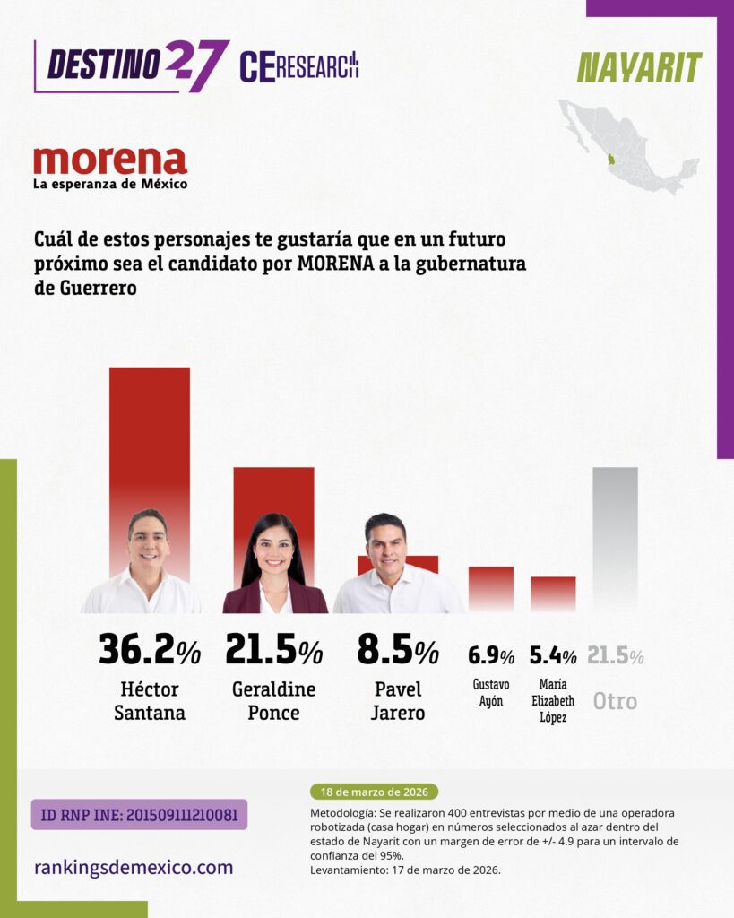 Héctor Santana se perfila como el favorito rumbo a las elecciones por la gubernatura de Nayarit. Destino 27, encuesta levantada por CE Research, revela que el alcalde de Bahía de Banderas se llevaría el triunfo no solo con Morena, sino como candidato del Partido del Trabajo.