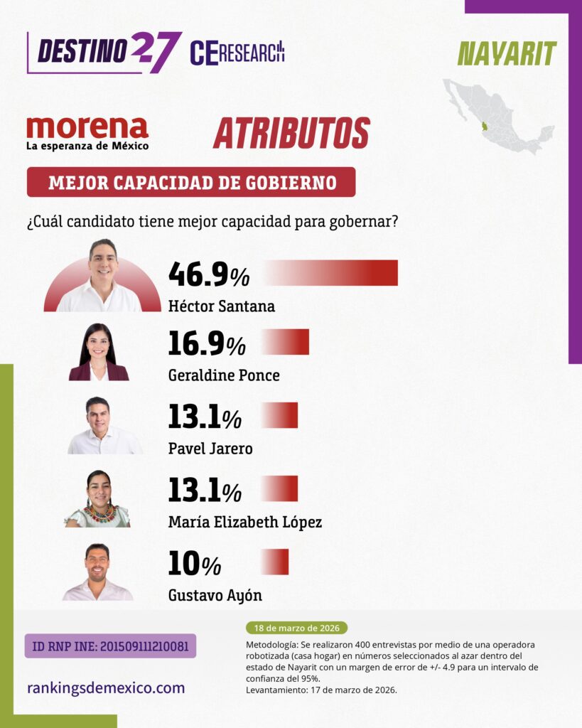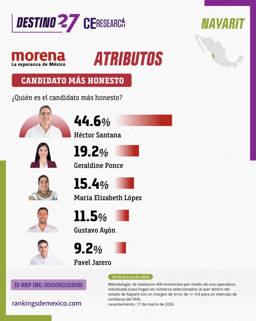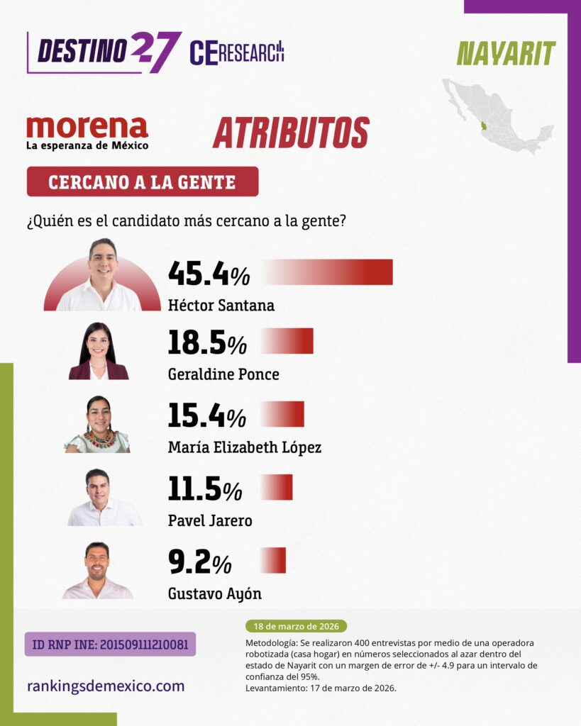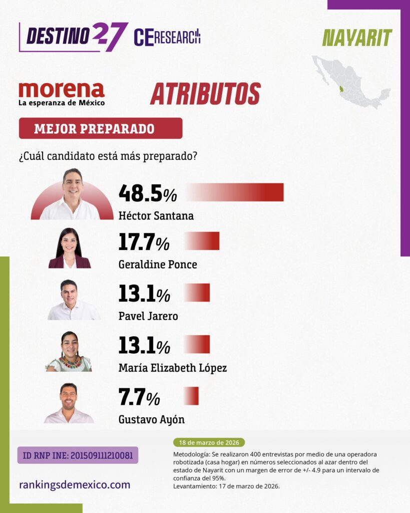 En la medición sobre quién debería ser el candidato morenista, Santana obtiene el 36.2%, superando por prácticamente 15 puntos a Geraldine Ponce, quien registra el 21.5%. Además de liderar en preferencia directa, Santana encabeza los cuatro principales atributos que Morena toma en consideración para definir a sus candidatos. En honestidad alcanza el 44.6% de las menciones, en cercanía con la gente obtiene el 45.4%, en preparación registra el 48.5%, y en capacidad para gobernar llega al 46.9%, superando ampliamente a los demás perfiles.