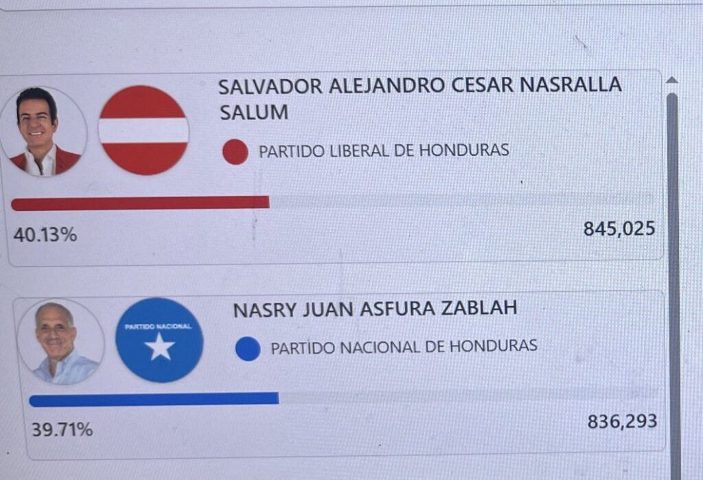 El último corte del CNE indica que Salvador Nasralla cuenta con el 40.13% de los votos, equivalentes a 845 mil 025 sufragios; mientras que “Tito” Asfura registra el 39.71%, equivalente a 836 mil 293 votos. En el tercer puesto continúa la izquierdista Rixi Moncada, con el 19.18%.