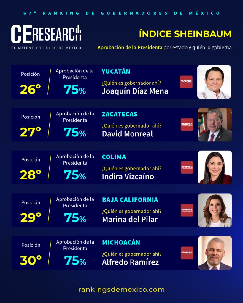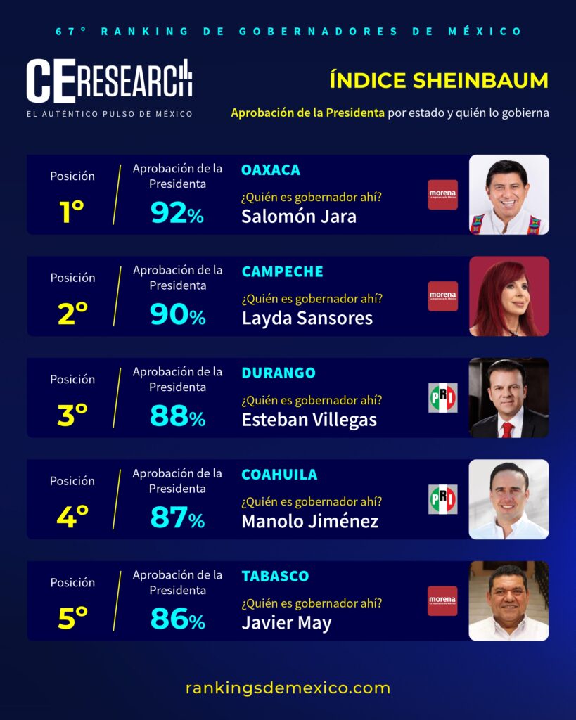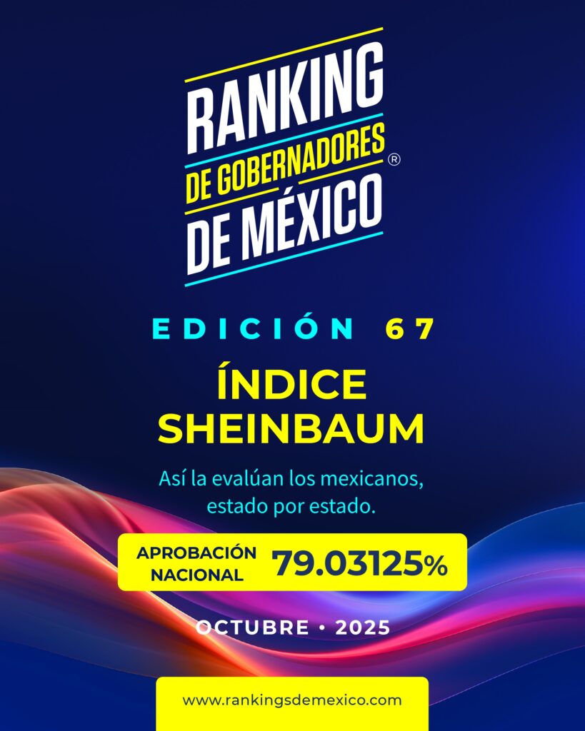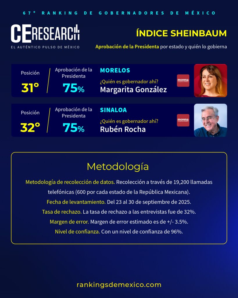 CE Research. 05 de octubre 2025.- La presidenta de México, Claudia Sheinbaum, recuperó su alto índice de popularidad con 79%. Justo a un año de su gobierno y tras su acto de celebración en el zócalo, prácticamente 8 de cada 10 mexicanos avalan su trabajo. Oaxaca, Campeche y Durango son los estados en donde mejor la evalúan, mientras que Sinaloa, Morelos y Michoacán son las entidades en donde más baja calificación tiene, aunque ahí, 3 de cada 4 ciudadanos aplauden su labor.