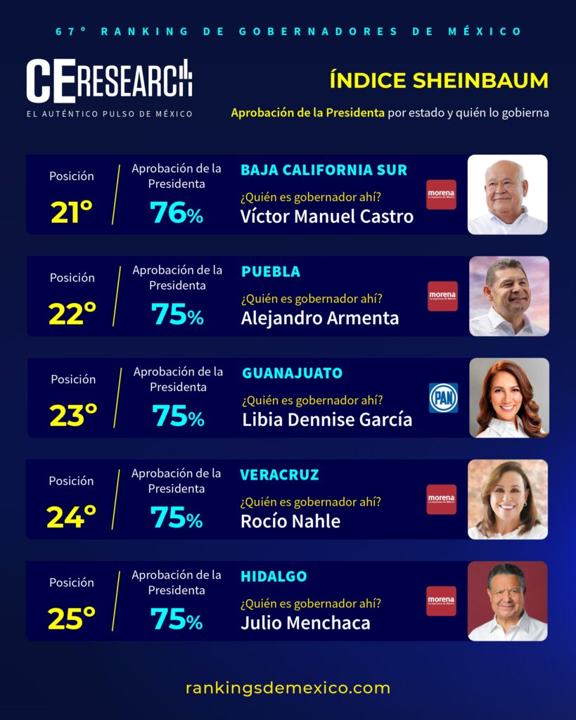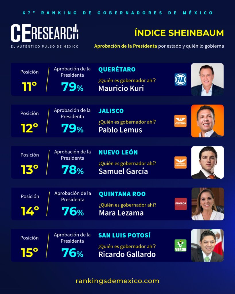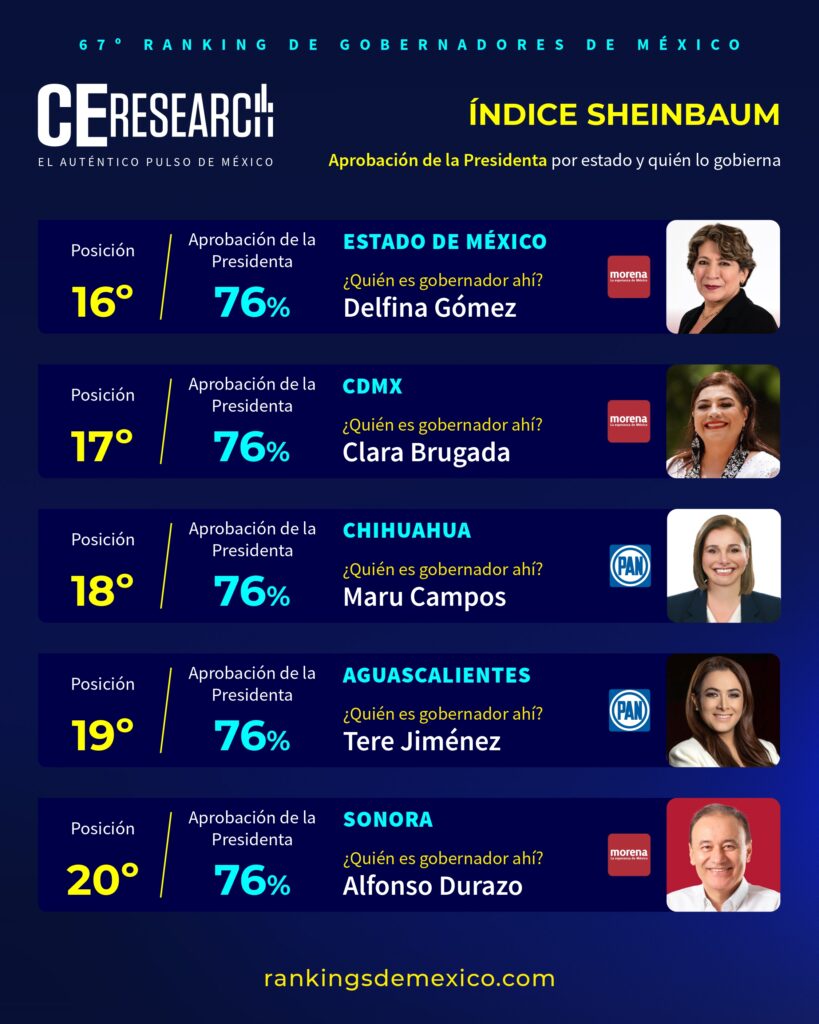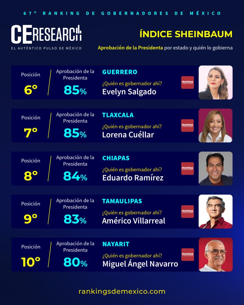 CE Research. 05 de octubre 2025.- La presidenta de México, Claudia Sheinbaum, recuperó su alto índice de popularidad con 79%. Justo a un año de su gobierno y tras su acto de celebración en el zócalo, prácticamente 8 de cada 10 mexicanos avalan su trabajo. Oaxaca, Campeche y Durango son los estados en donde mejor la evalúan, mientras que Sinaloa, Morelos y Michoacán son las entidades en donde más baja calificación tiene, aunque ahí, 3 de cada 4 ciudadanos aplauden su labor.