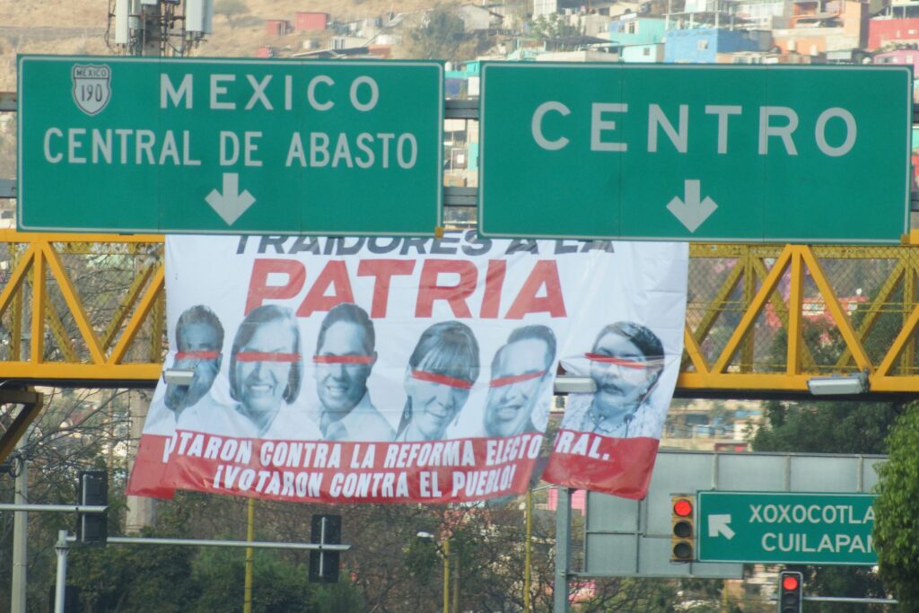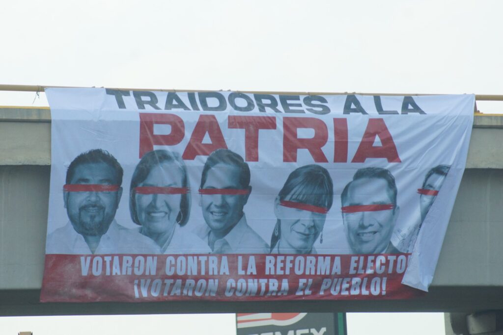 En las lonas aparecen los diputados Alejandro Avilés y Raúl Bolaños-Cacho, del PVEM, así como Margarita García, Maribel Martínez y Aracely Cruz, del PT, con las leyendas “Traidores a la patria” y “Votaron contra la Reforma Electoral, ¡votaron contra el pueblo!”.