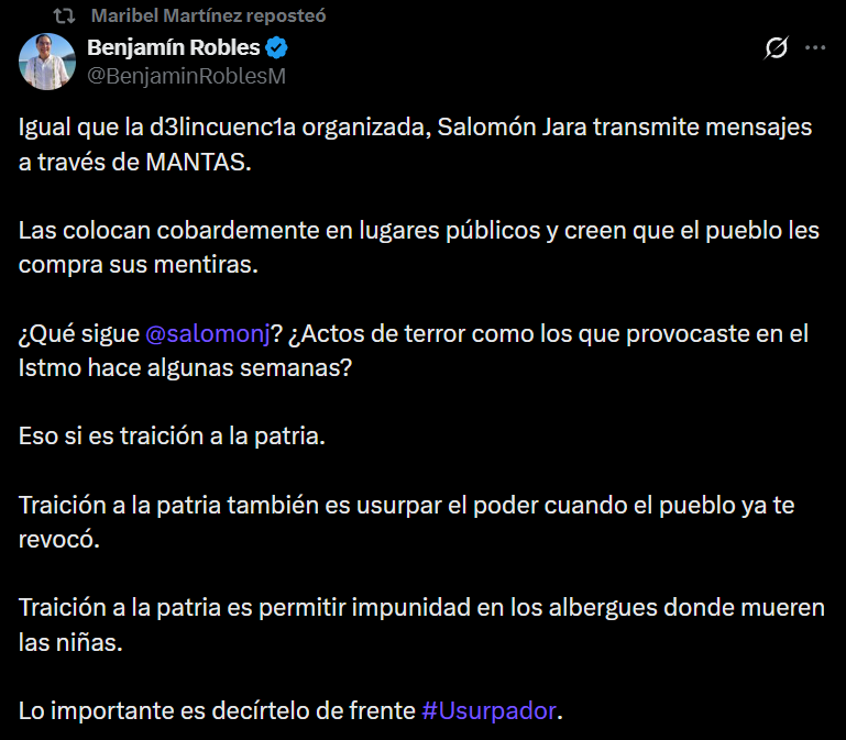 Hasta el momento se desconoce la organización o grupo que estaría detrás de la acción, pero Margarita Garcia y Maribel Martínez ya emitieron sus posicionamientos. García aseveró que “Una verdadera izquierda no recurriría a lo ruin y tiránico”, mientras que Martínez reposteó en X una publicación en la que acusan al gobernador Salomón Jara de ser el responsable.