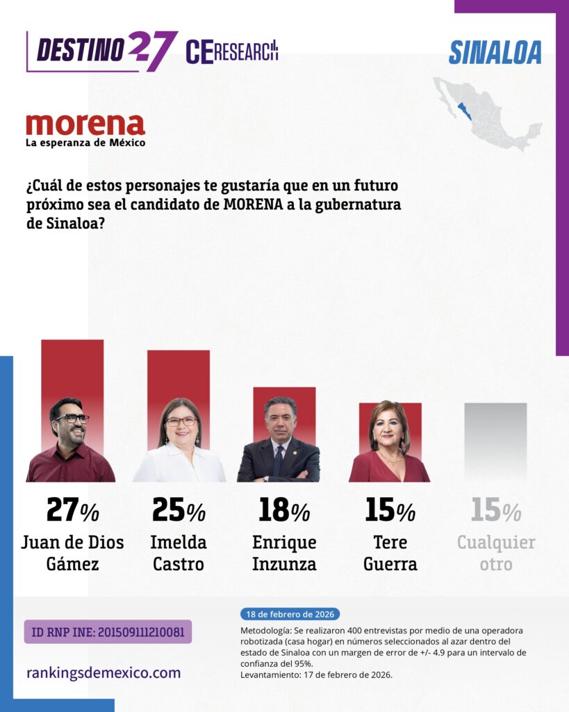En Sinaloa, la contienda interna de Morena por las candidaturas para la gubernatura de 2027 muestra un escenario competido entre Juan de Dios Gámez e Imelda Castro, según reveló la más reciente edición de Destino 27, sondeo levantado por CE Research.