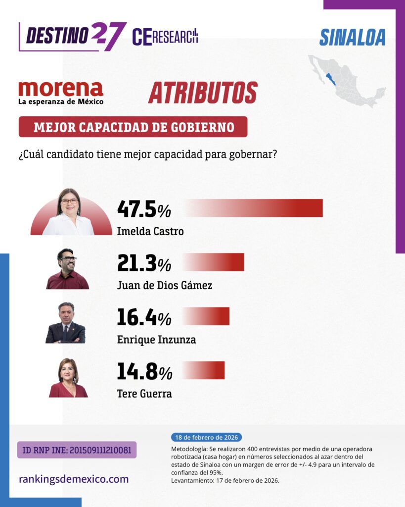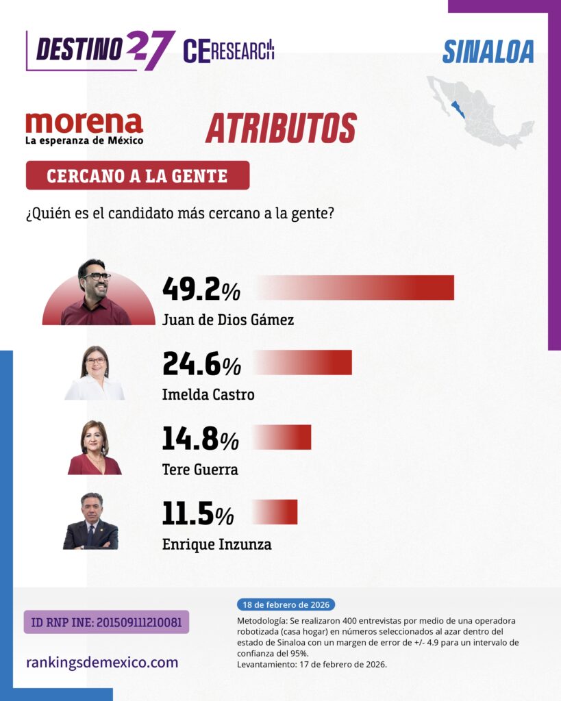 Juan de Dios Gámez, presidente municipal de Culiacán, obtiene 27% de menciones para ser el candidato morenista, mientras que la senadora Imelda Castro registra 25%. En la evaluación de criterios partidistas, Gámez obtiene las 49.2% en cuanto a Honestidad y Cercanía Ciudadana, mientras que Castro encabeza las percepciones de Preparación (44.3%) y Capacidad de Gobierno (47.5%).