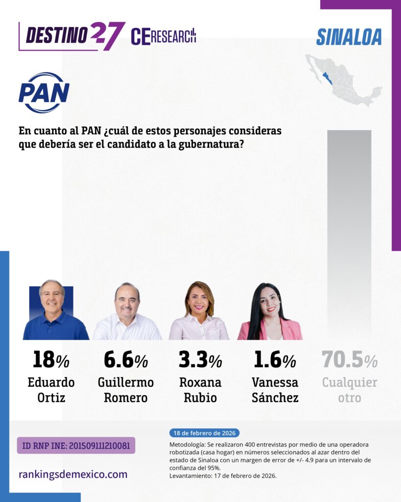 En el PAN, 18% menciona a Eduardo Ortiz como posible candidato, mientras que 70.5% prefiere otro perfil. En el PRI, la diputada Paloma Sánchez (16.4%) y Mario Zamora (14.8%) encabezan las menciones, aunque 52.5% opta por cualquier otro nombre.