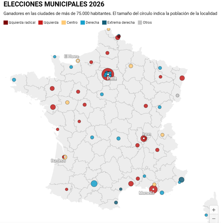 Tres ciudades de más de 100 mil habitantes estarán gobernadas por alcaldes de izquierda radical: en Saint-Denis, Bally Bagayoko (LFI) se impuso en primera vuelta; en Montreuil, Patrice Bessac (PCF) fue reelegido; y en Saint-Paul (La Reunión), Emmanuel Séraphin (PLR) ganó en segunda vuelta con una ventaja de diez puntos sobre su rival derechista.