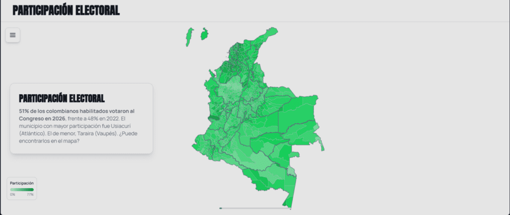 51% de los colombianos habilitados votaron al Congreso en 2026, frente a 48% en 2022. El municipio con mayor participación fue Usiacurí (Atlántico). El de menor, Taraira (Vaupés).