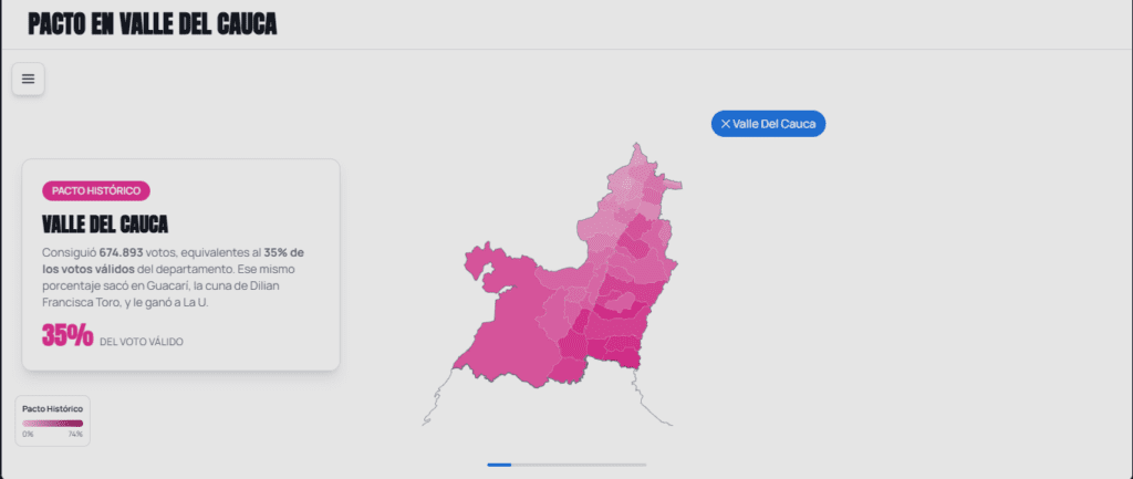Consiguió 617.109 votos, equivalentes al 35% de los votos válidos del departamento. Ese mismo porcentaje sacó en Guacarí, la cuna de Dilian Francisca Toro, y le ganó a La U.