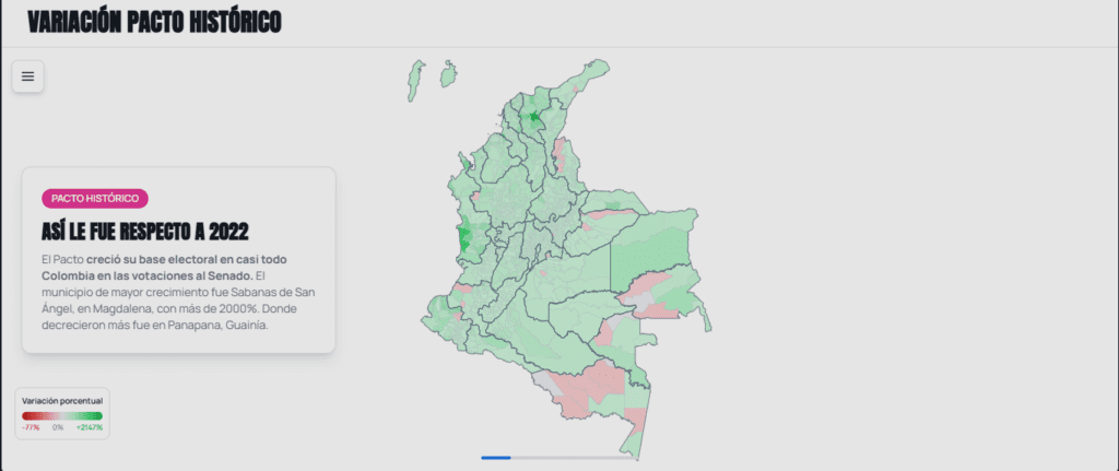 El Pacto creció su base electoral en casi todo Colombia en las votaciones al Senado. El municipio de mayor crecimiento fue Sabanas de San Ángel, en Magdalena, con más de 2000%. Donde decrecieron más fue en Panapana, Guainía.