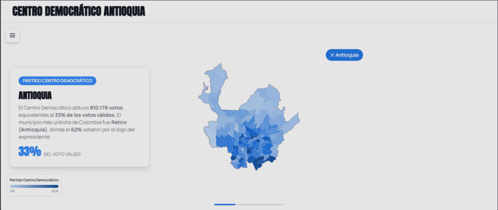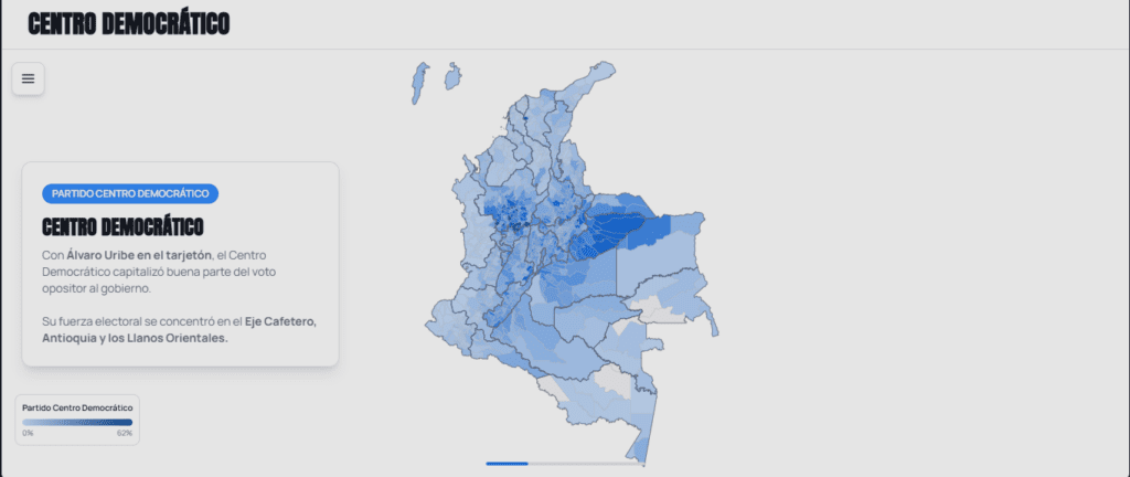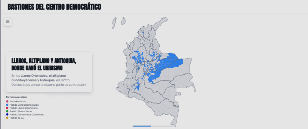 En los Llanos Orientales, el altiplano cundiboyacense y Antioquia, el Centro Democrático concentra buena parte de su votación.
