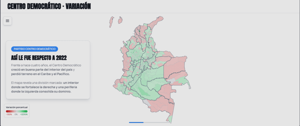 Frente a hace cuatro años, el Centro Democrático creció en buena parte del interior del país y perdió terreno en el Caribe y el Pacífico.