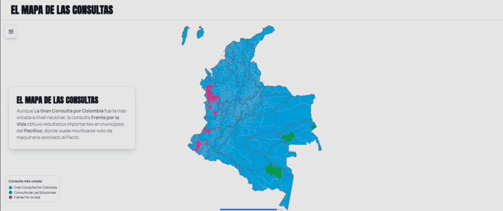 Aunque La Gran Consulta por Colombia fue la más votada a nivel nacional, la consulta Frente por la Vida obtuvo resultados importantes en municipios del Pacífico, donde suele movilizarse voto de maquinaria asociado al Pacto.