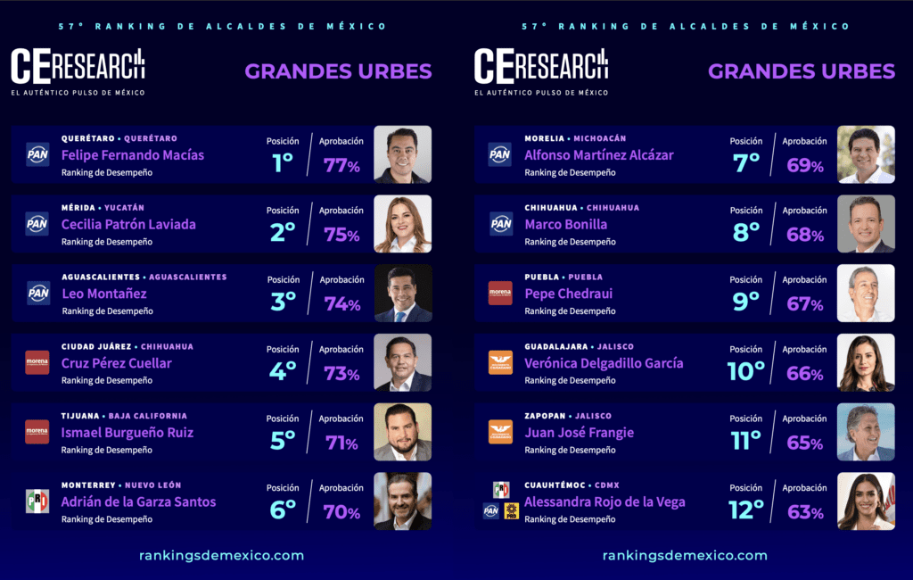 En cuarta y quinta posición se ubican los presidentes municipales de Ciudad Juárez, Cruz Pérez Cuéllar y de Tijuana, Ismael Burgueño, ambos de Morena, con 73 y 71% de aprobación a su desempeño, respectivamente.