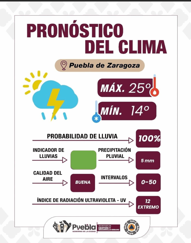 Puebla, Pue., a 23 de septiembre de 2025.- El Gobierno de la Ciudad informa que este martes se espera un día parcialmente nublado, con alta probabilidad de lluvia acompañada de tormenta eléctrica durante la tarde. Se estima una acumulación aproximada de entre 0 y 5 mm alrededor de las 19:00 horas. La temperatura oscilará entre una máxima de 25°C y una mínima de 14°C. Asimismo, se advierte que el índice de radiación ultravioleta se mantendrá en nivel extremo, por lo que es fundamental tomar precauciones para proteger la piel durante las horas de mayor exposición solar.