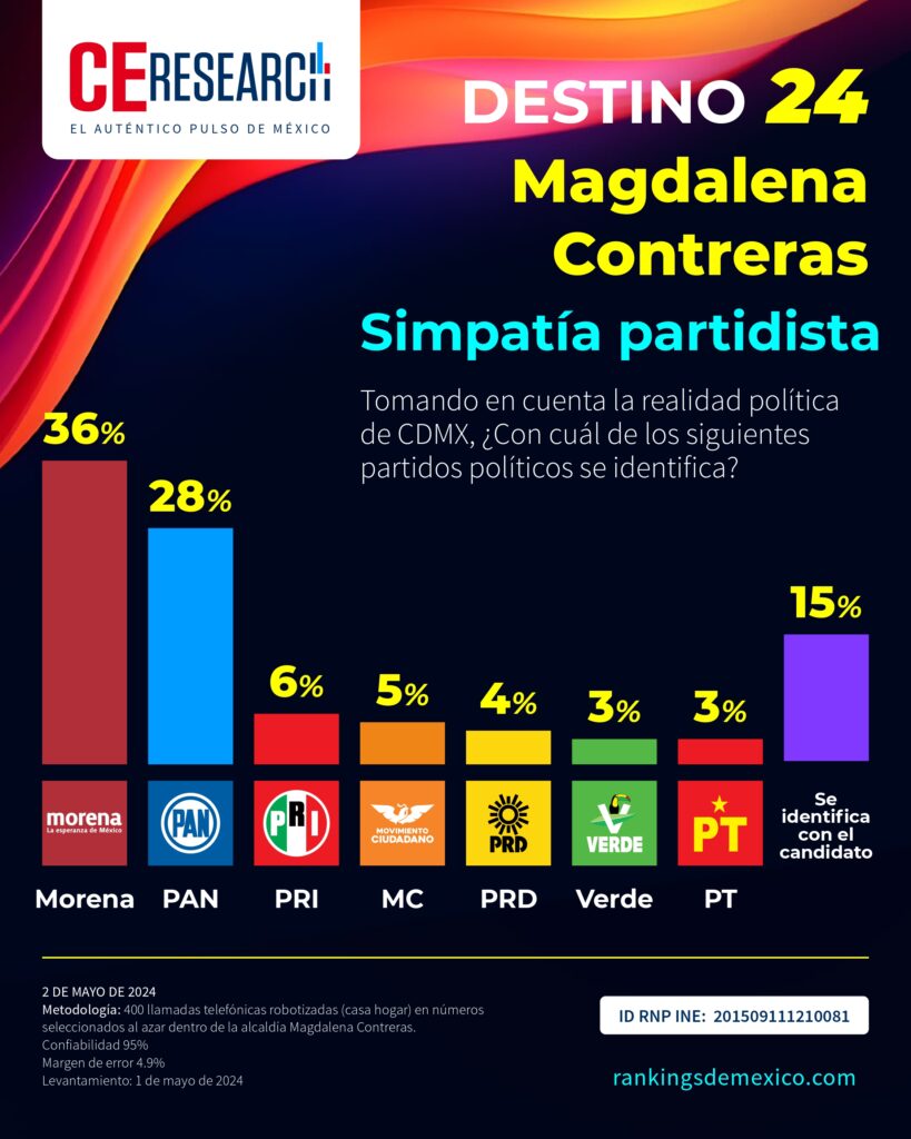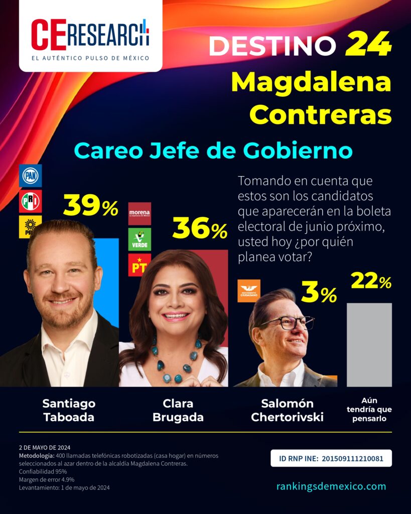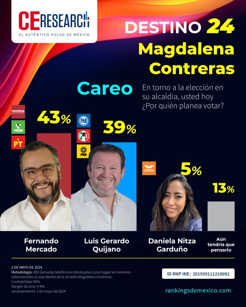 CE Research. 02 de mayo 2024.- Luis Gerardo Quijano, de la alianza PRI PAN PRD, se acerca a 4 puntos del morenista Fernando Mercado, quienes buscan la alcaldía de Magdalena Contreras.
