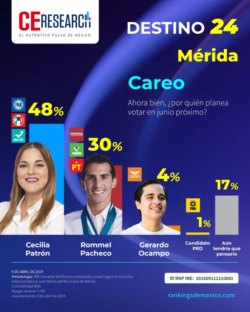 CE Research. 09 de abril 2024.- El clavadista Rommel Pacheco se ha estancado en los 30 puntos de preferencia electoral y ve de lejos a Cecilia Patrón. La aliancista le lleva 18 puntos de ventaja al neo morenista.