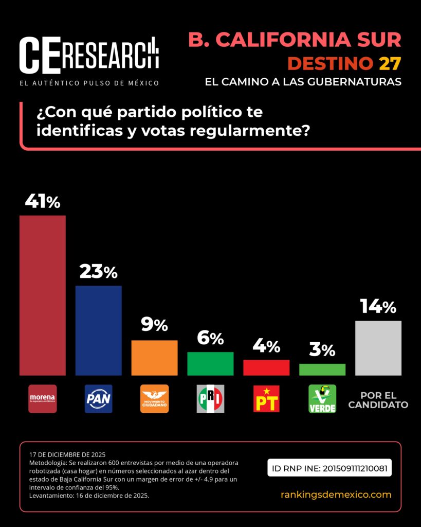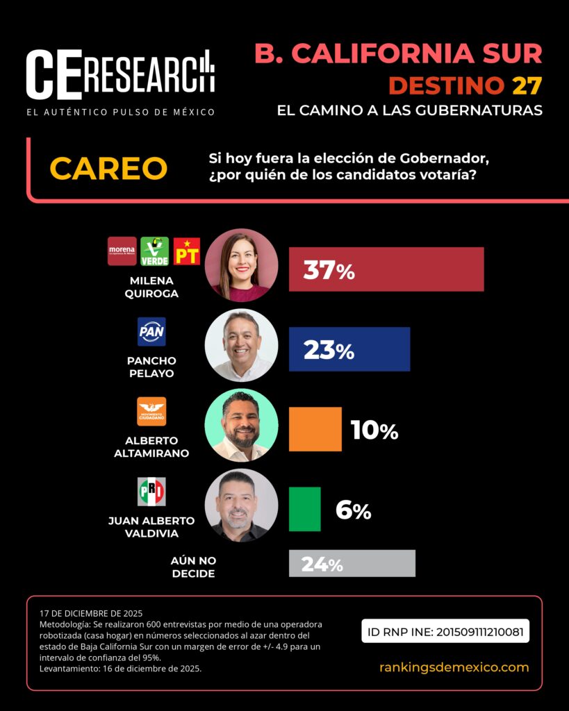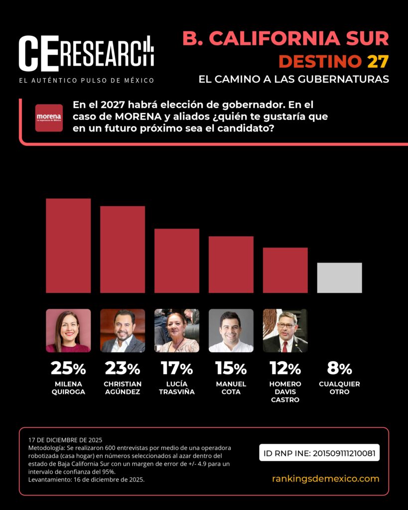 De la mano de Milena Quiroga, MORENA se consolida como el rival a vencer rumbo a la elección de gobernador de Baja California Sur en 2027, de acuerdo con la última edición de la encuesta levantada por CE Research, “Destino 27”.