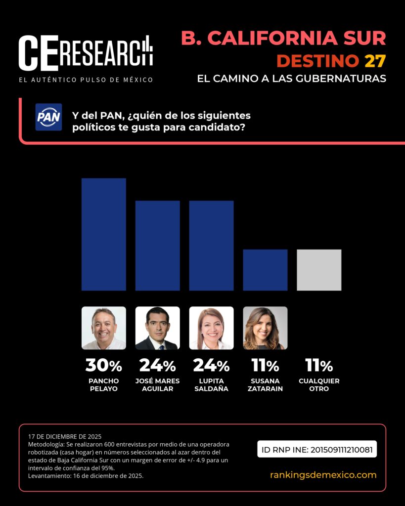 En contraste, el PAN demuestra seguir vigente en Baja California Sur y tiene en el diputado Pancho Pelayo a su aspirante más fuerte. El legislador encabeza las preferencias internas del blanquiazul con el 30%, seguido por José Mares Aguilar y Lupita Saldaña, ambos con 24%.