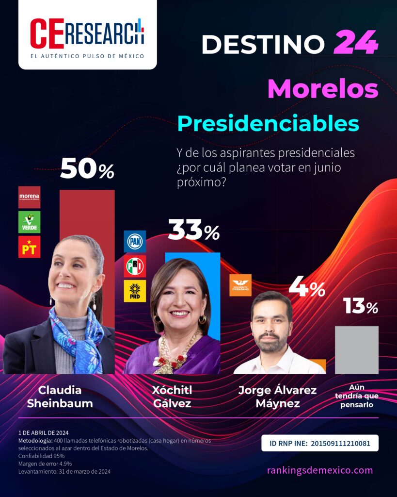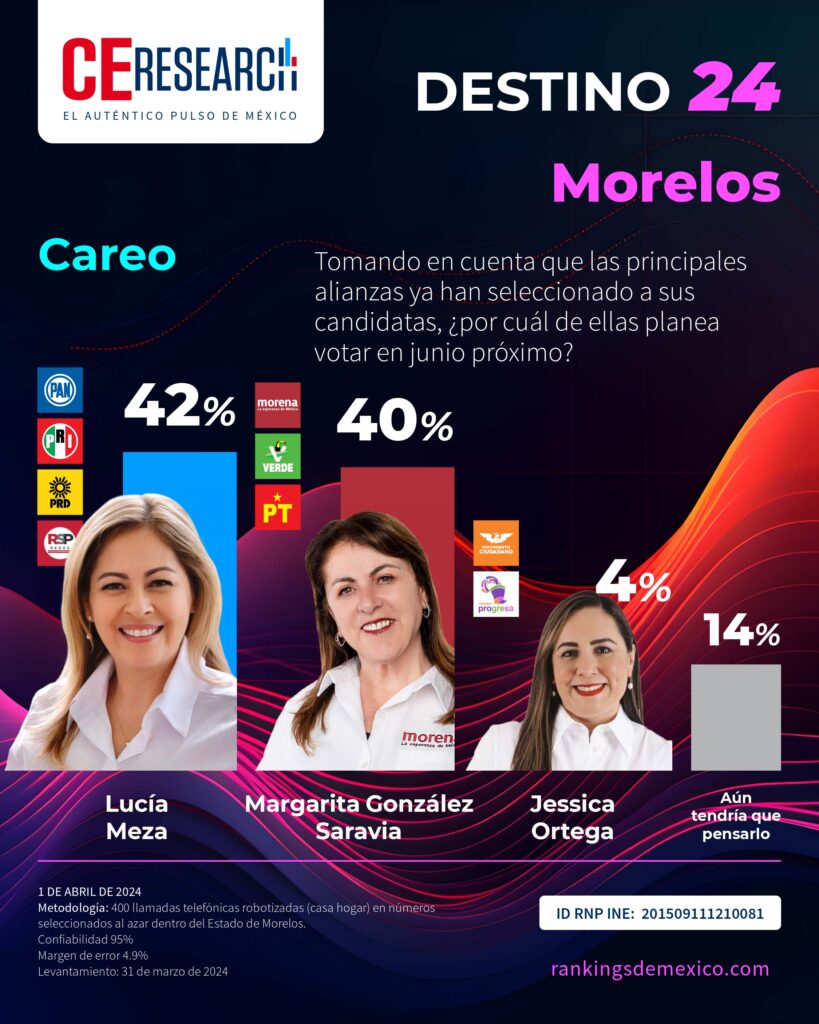CE Research. 01 de abril 2024.- Lucía Meza rebasa por la izquierda a Margarita González por vez primera en lo que va de nuestras mediciones. La ex senadora por MORENA hace valer el dicho de “para que la cuña apriete…” y a un mes de campaña aventaja por dos puntos a la ex directora de la Lotería Nacional.