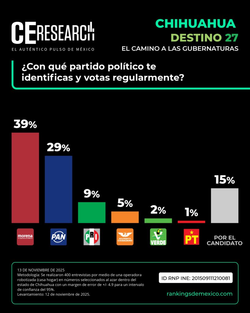 Destino 27, sondeo estatal mensual elaborado por la encuestadora de esta casa editorial, CE Research, arrojó que en Chihuahua, Morena mantiene una ventaja de diez puntos sobre el PAN, partido gobernante, en la identificación partidista -39% frente a 29%-, lo que coloca al partido guinda como la fuerza más competitiva rumbo a las elecciones de 2027. Sin embargo, el conflicto no se da contra la oposición, sino al interior de Morena.
