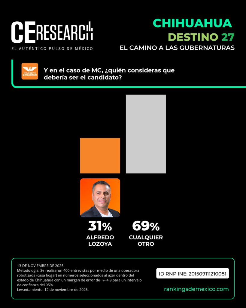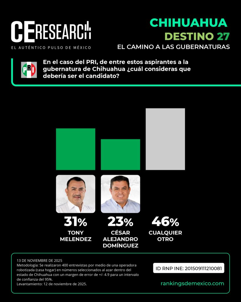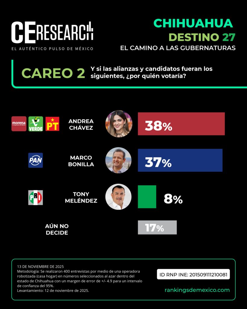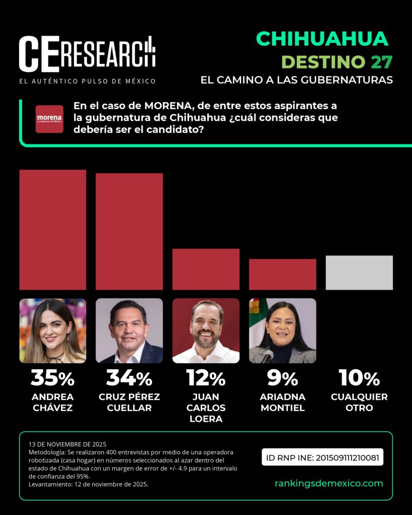 La senadora Andrea Chávez va a la delantera con 35%, pero detrás de ella por solo un punto debajo se encuentra el alcalde de Ciudad Juárez, Cruz Pérez Cuéllar, con 34%. Muy por debajo se ubican Juan Carlos Loera con 12% y Ariadna Montiel con 9%, mientras que 10% prefiere otro aspirante.
