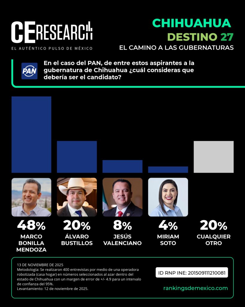 En contraste, el PAN sí tiene una figura definida. Su favorito es el alcalde de la capital, Marco Bonilla, quien concentra 48% de respaldo dentro de su partido. Muy lejos quedan Álvaro Bustillos con 20%, Jesús Valenciano con 8% y Miriam Soto con 4%, mientras un 20% mencionó otra opción.