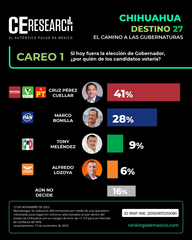 Ambos también dominan los careos, pero con una diferencia de 3 puntos. En el primer escenario, Cruz Pérez Cuéllar obtendría 41%, superando con amplitud a Marco Bonilla (PAN), que suma 28%. Más atrás aparecen Tony Meléndez (PRI) con 9% y Alfredo Lozoya (MC) con 6%, mientras que 16% no ha decidido su voto.