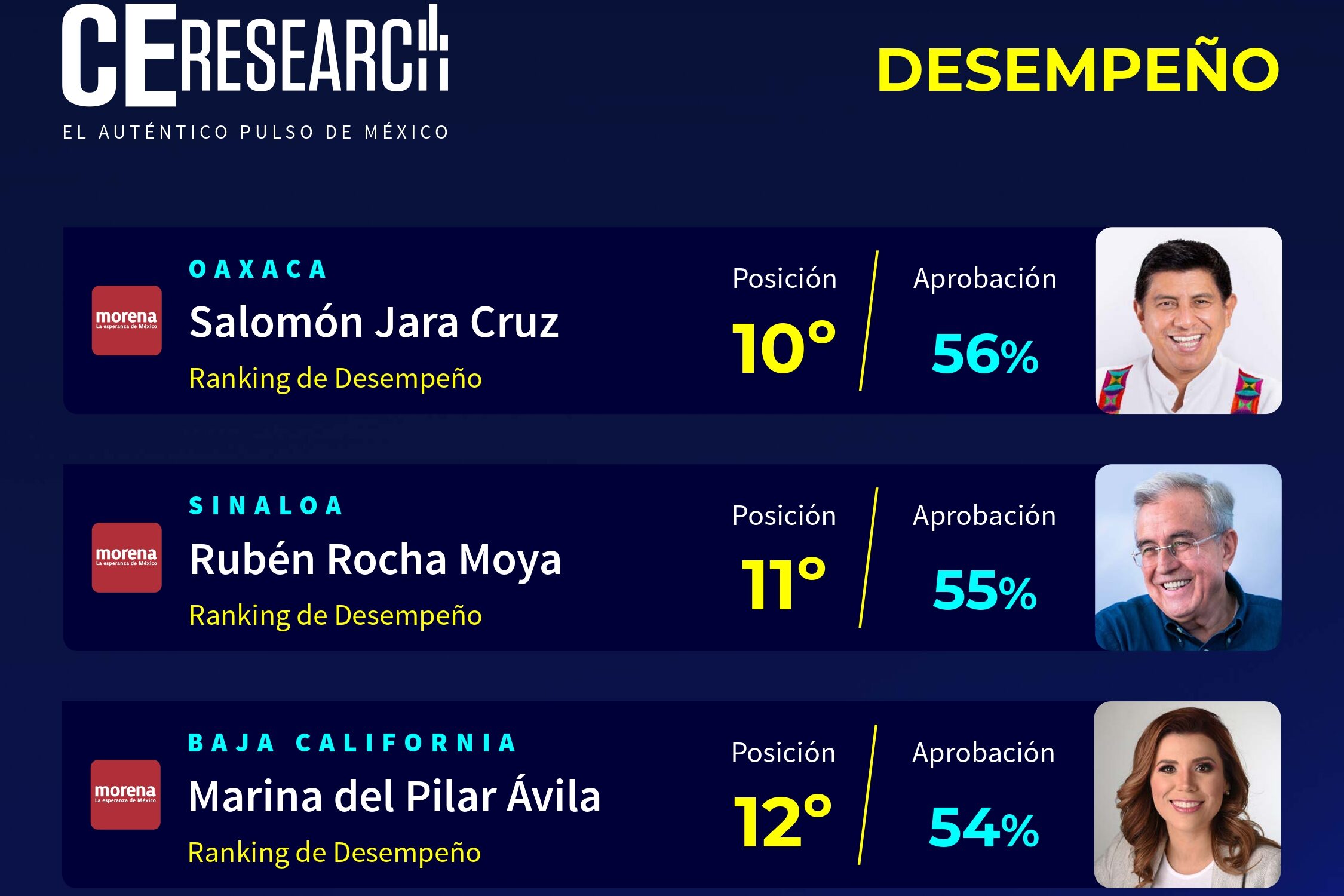 Completan el Top Ten el gobernador de Jalisco, Pablo Lemus (Movimiento Ciudadano); seguido de su compañero de partido y gobernador de Nuevo León, Samuel García; y cierran los morenistas Evelyn Salgado de Guerrero, Clara Brugada de la Ciudad de México y Salomón Jara de Oaxaca.