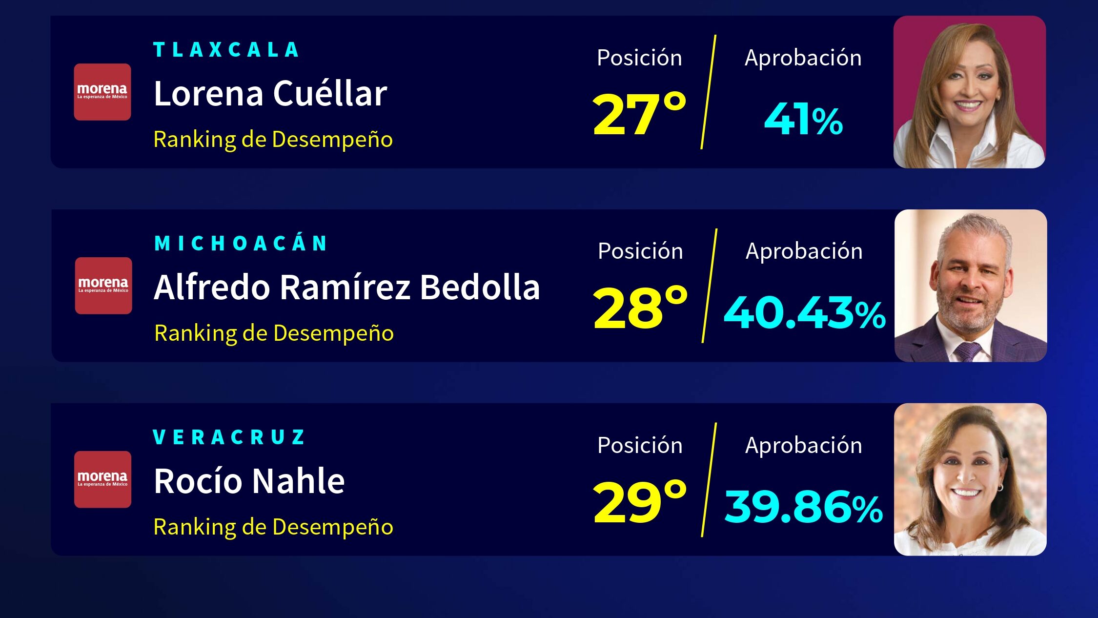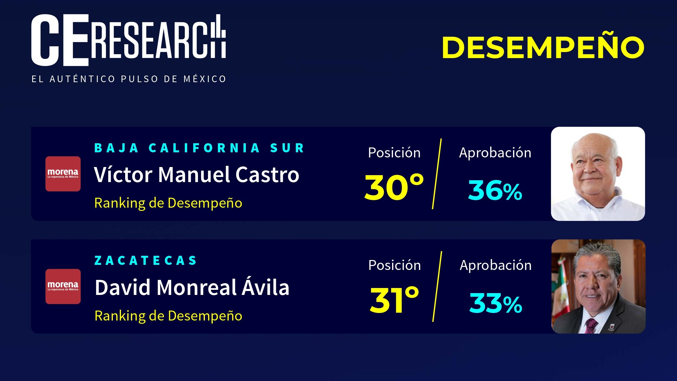 Al final de la evaluación se encuentra el gobernador de Zacatecas, David Monreal Ávila (Morena) con apenas el 31 por ciento de aprobación; seguido del mandatario de Baja California Sur, Víctor Manuel Castro; y la gobernadora de Veracruz, Rocío Nahle García.