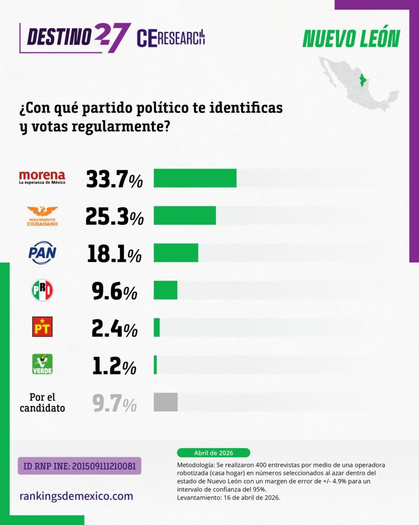 El estudio mide la competencia rumbo a la gubernatura de Nuevo León en 2027. Evalúa tres capas de información: identidad partidista, posicionamiento interno de aspirantes de MORENA y Movimiento Ciudadano, y escenarios de careo entre posibles candidatos.