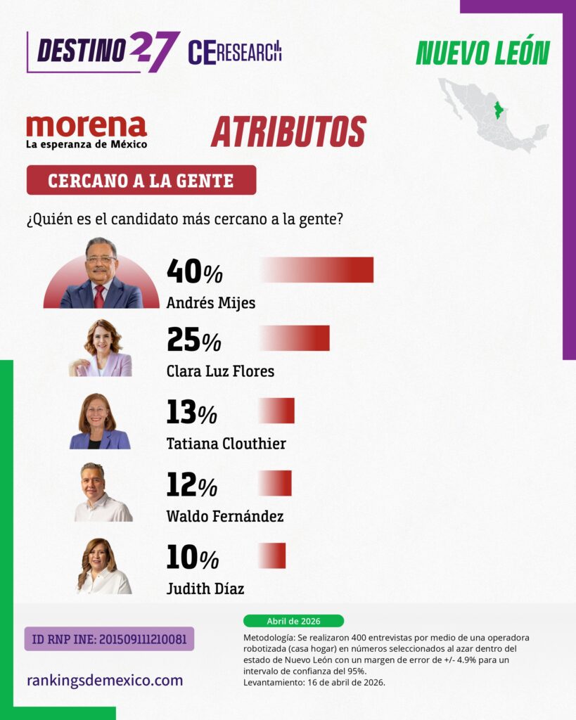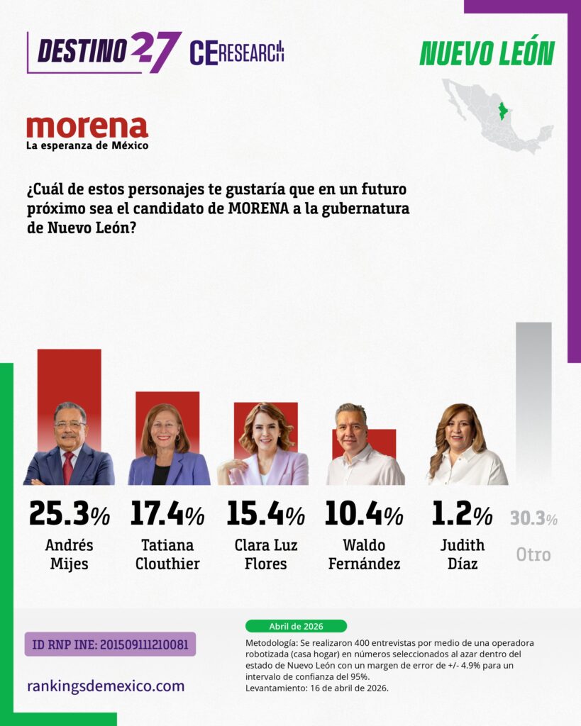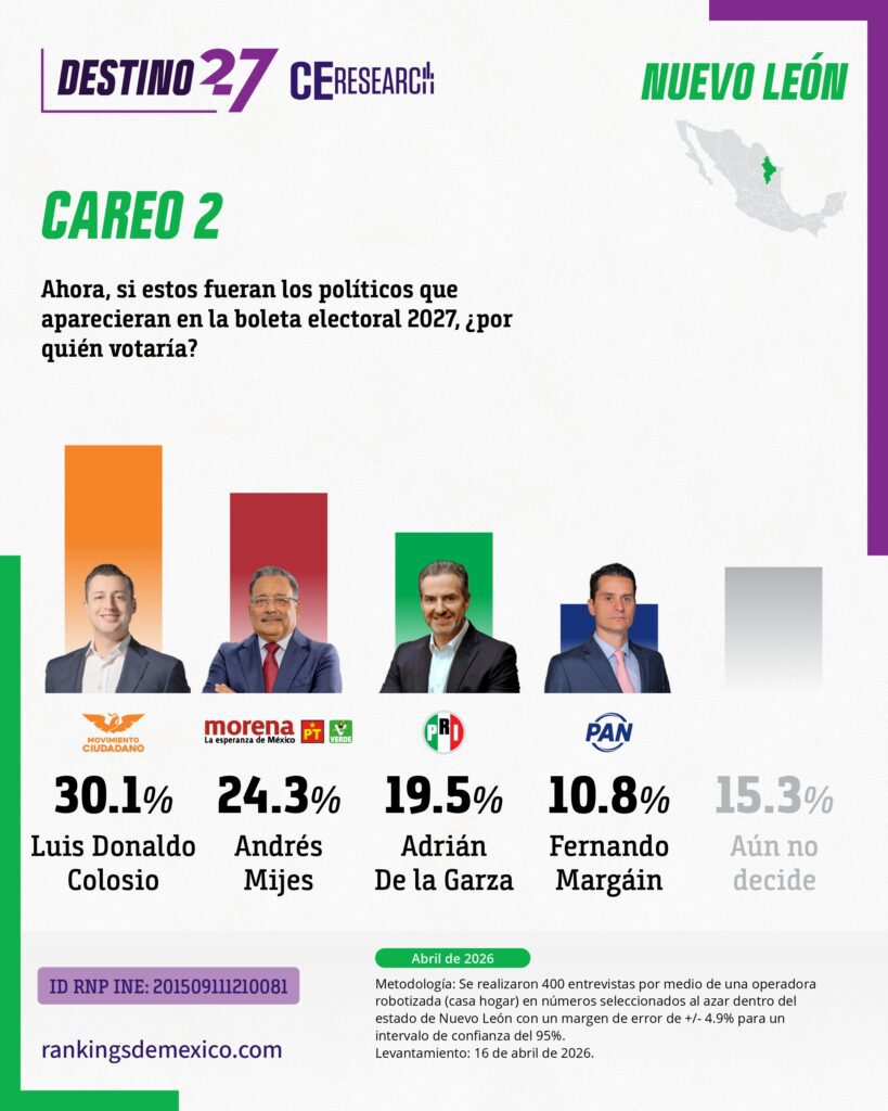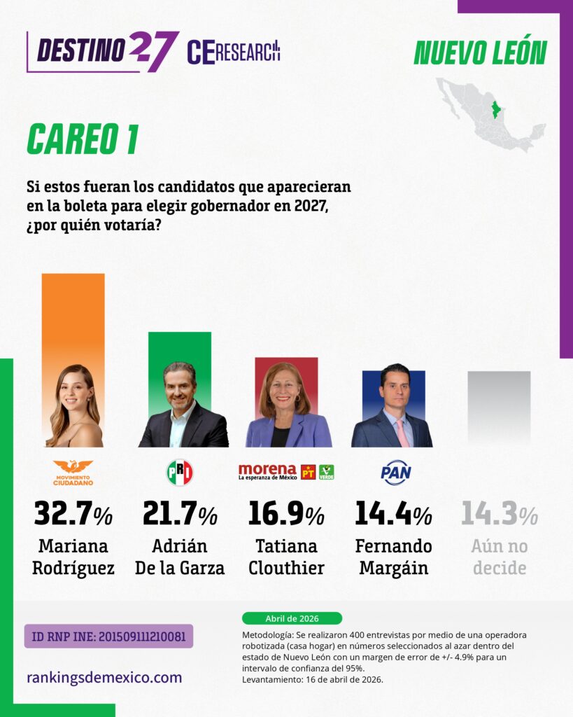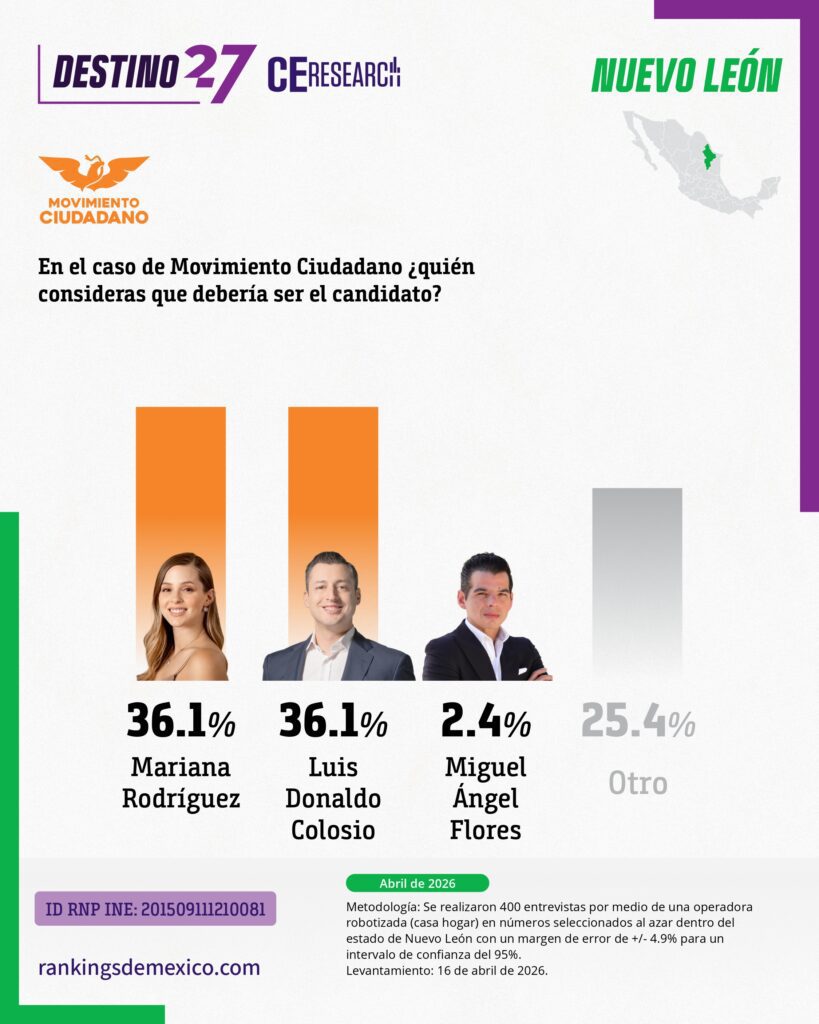 CE Research. 17 de abril 2026.- Los candidatos de MC siguen siendo los favoritos para ganar la elección a gobernador de Nuevo León el año que viene. Mariana Rodríguez y Luis Donaldo Colosio amanecen empatados en la preferencia ciudadana para escoger aspirante naranja.