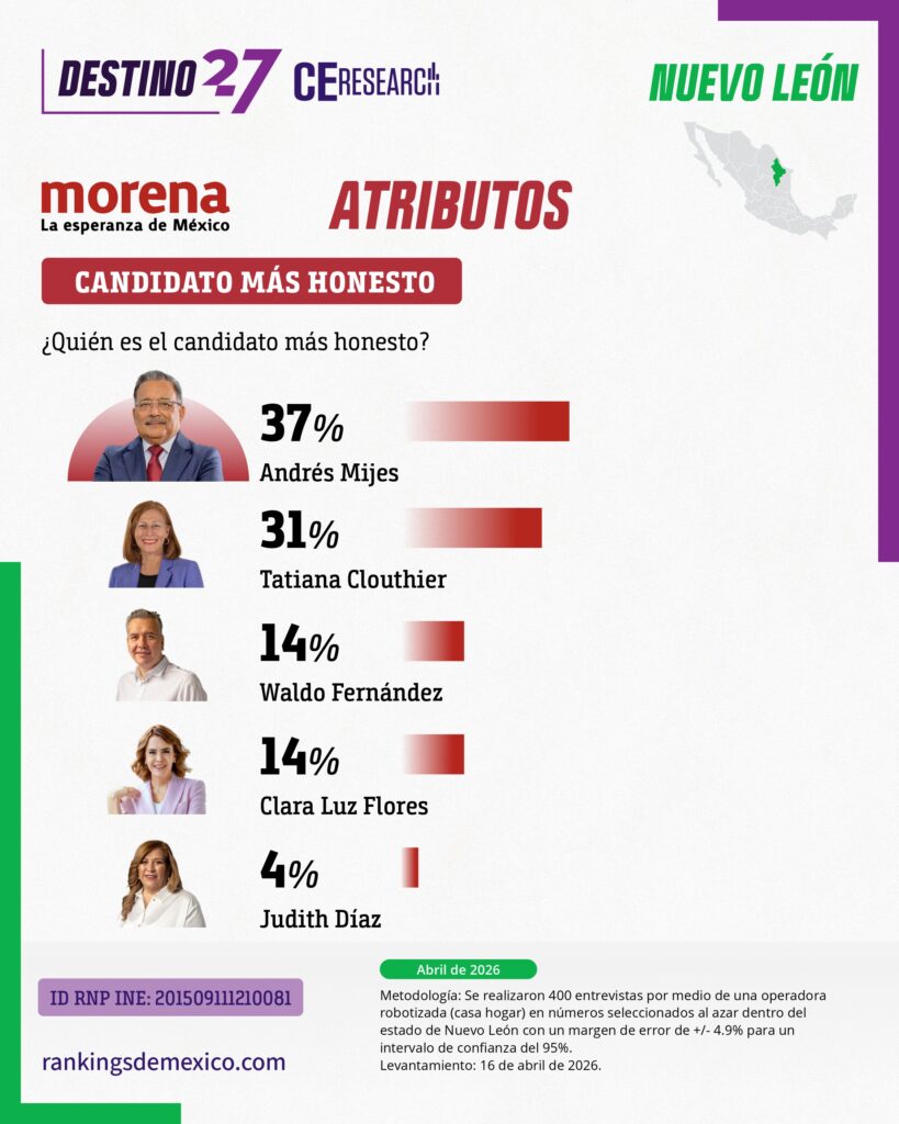 No ocurre así en MORENA, donde el alcalde de Escobedo, Andrés Mijes, mantiene distancia con Tatiana Clouthier en intención de voto y en atributos.