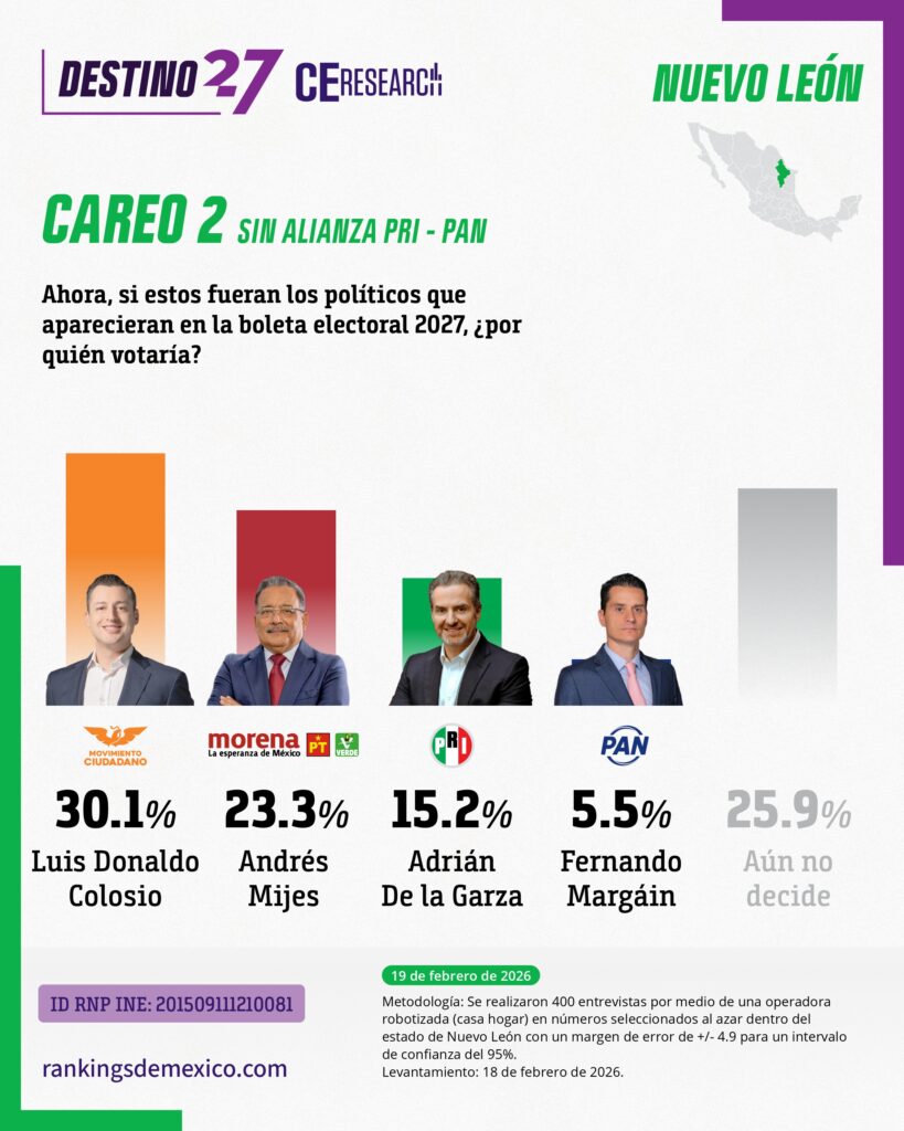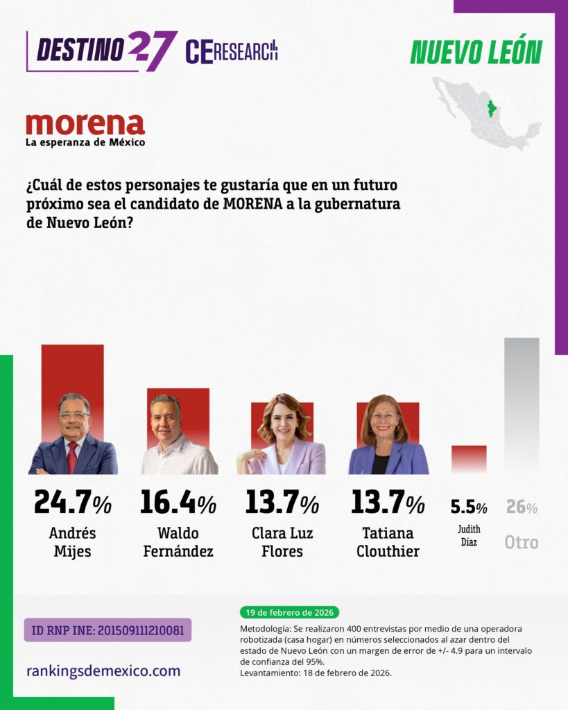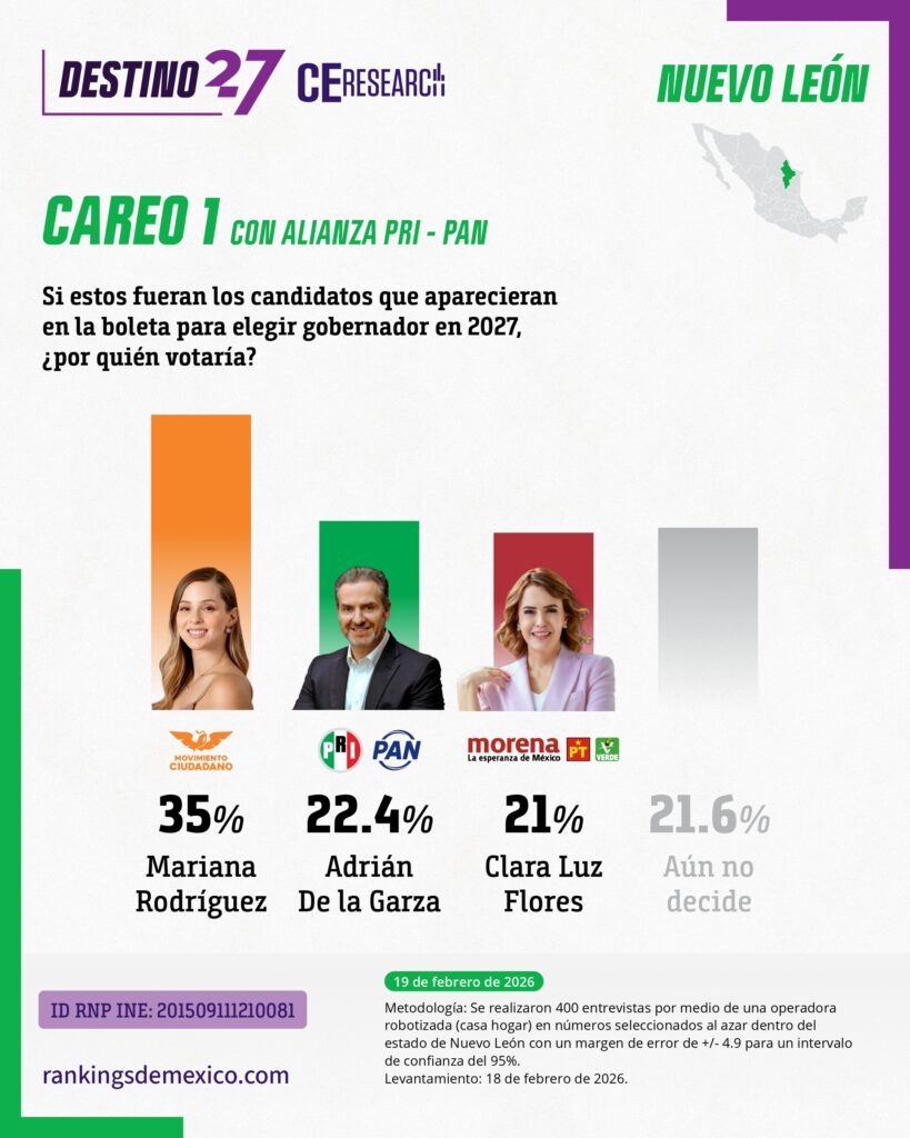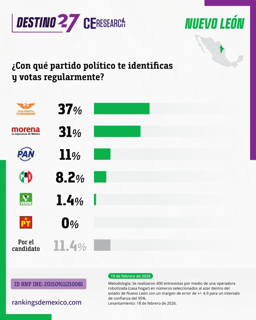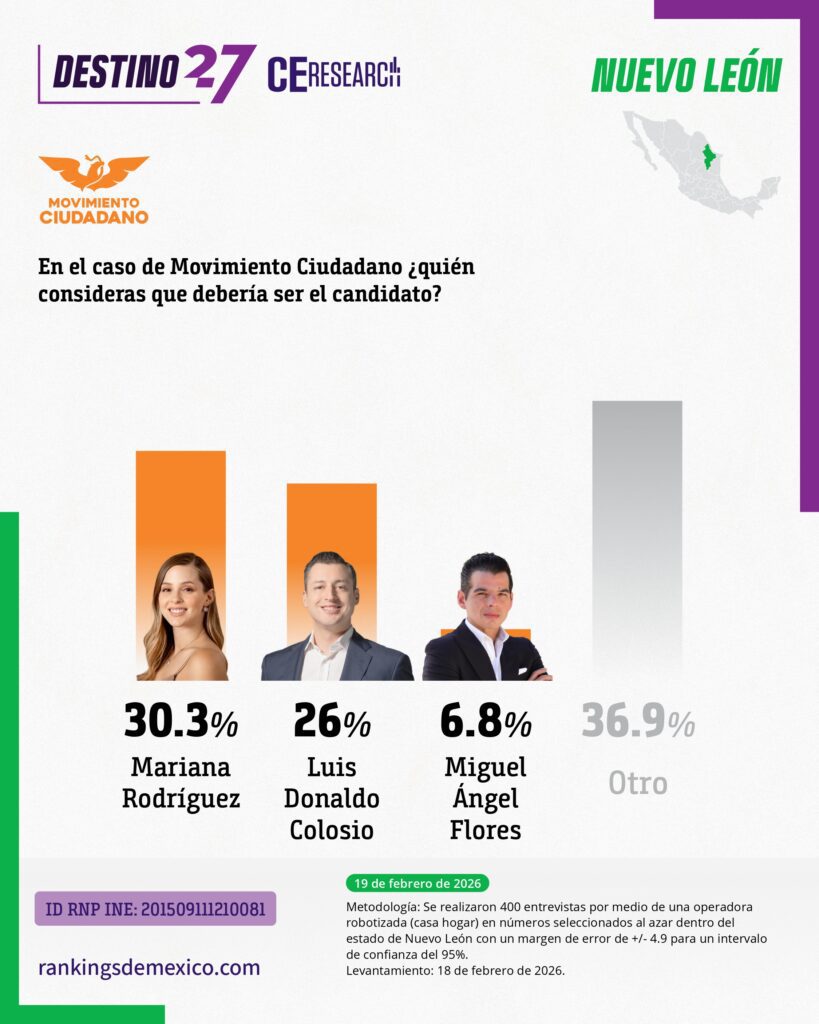 CE Research. 19 de febrero 2026.- MC, Mariana Rodríguez y Luis Donaldo Colosio llevan la delantera en Nuevo León. El partido naranja es el favorito de los neoleoneses para ganar la elección del 2027, y tanto la primera dama como el ex alcalde ganarían la elección constitucional dejando atrás al alcalde capitalino o al representante de MORENA.