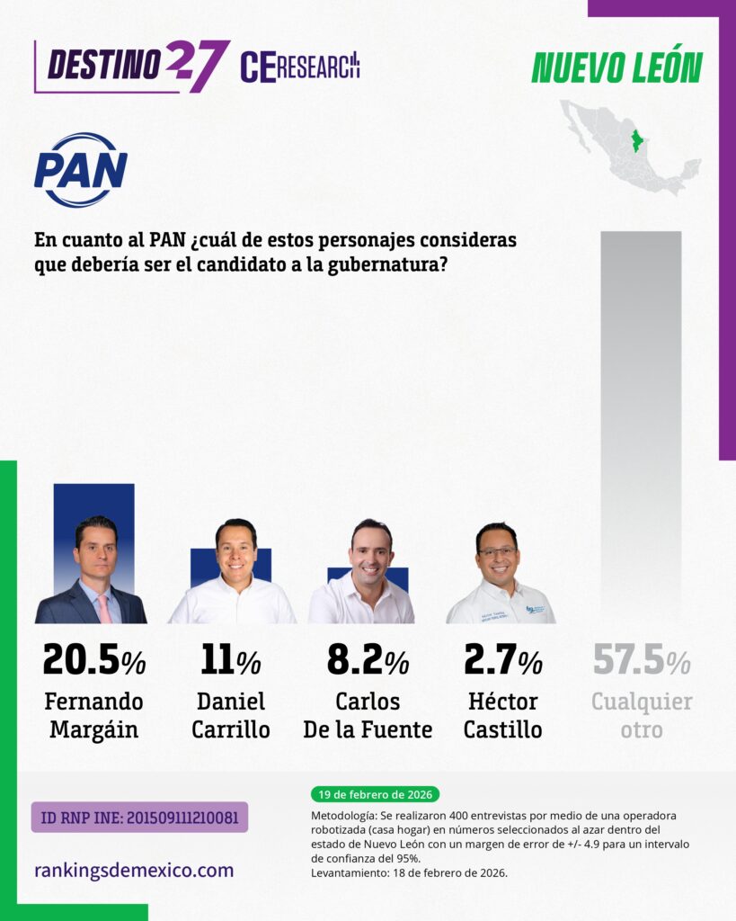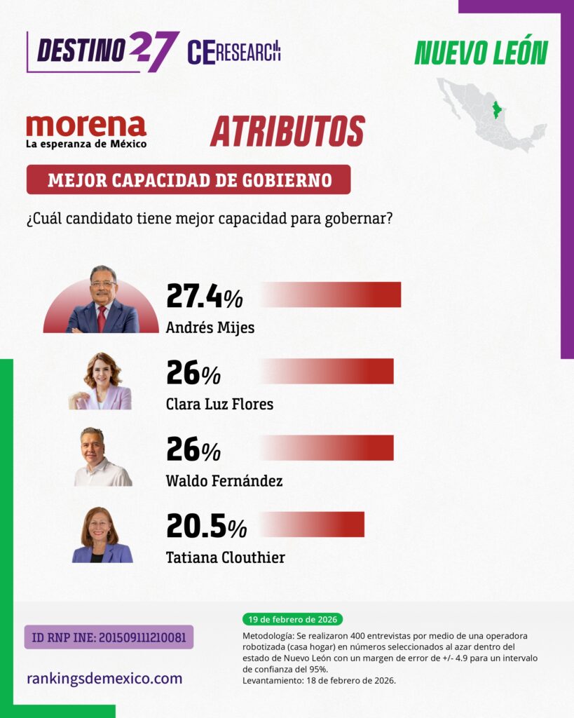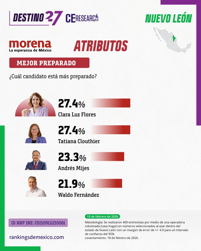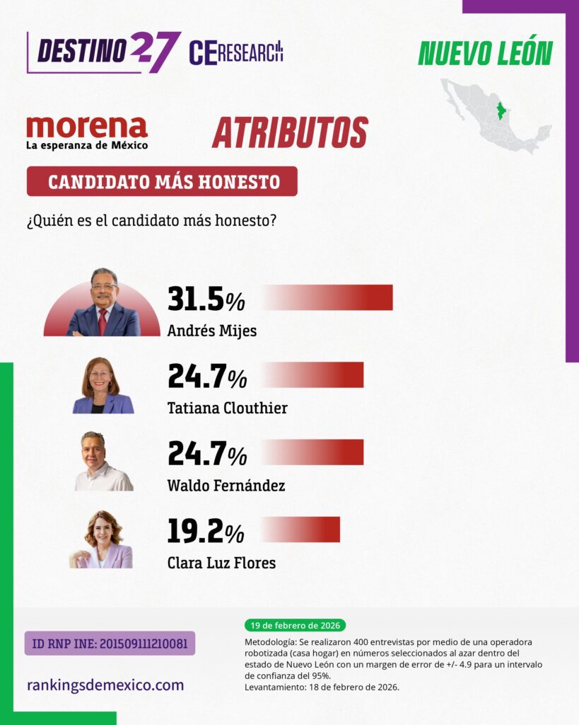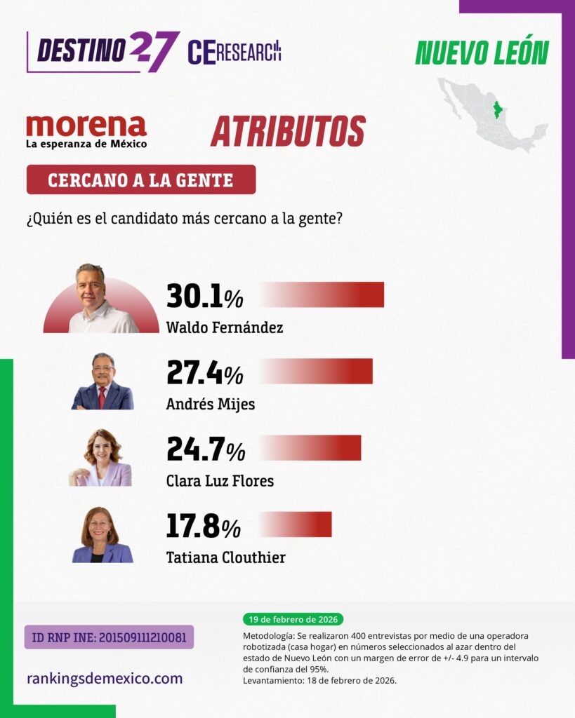 CE Research. 19 de febrero 2026.- MC, Mariana Rodríguez y Luis Donaldo Colosio llevan la delantera en Nuevo León. El partido naranja es el favorito de los neoleoneses para ganar la elección del 2027, y tanto la primera dama como el ex alcalde ganarían la elección constitucional dejando atrás al alcalde capitalino o al representante de MORENA.