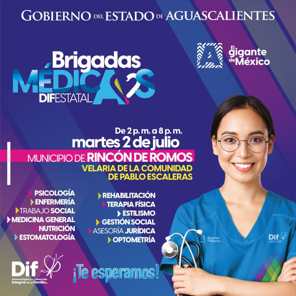 El Sistema para el Desarrollo Integral de la Familia (DIF) Estatal anunció que llevará a cabo una Brigada Médica en el municipio de Rincón de Romos el próximo martes 2 de julio en la velaria de la comunidad Pablo Escaleras, en un horario de 2:00 p. m. a 8:00 p. m.