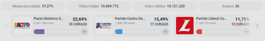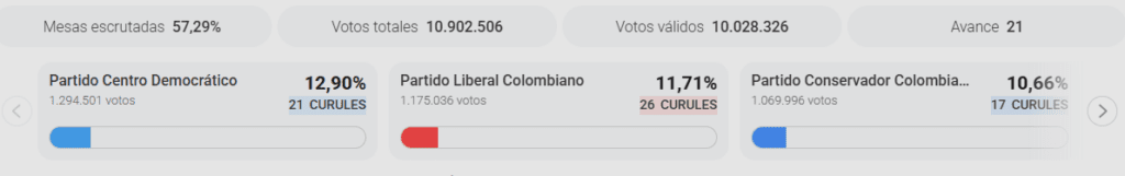 Con el 57.29% de las mesas contadas, la Cámara de Representantes está siendo dominada por Centro Democrático, aventajando por más de 57 mil votos al Partido Liberal Colombiano. Estos son los 10 primeros lugares: