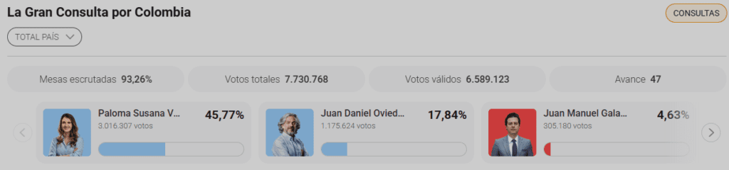 Paloma Valencia, senadora uribista, gana la Gran Consulta por Colombia, registrando hasta el último corte 3 millones 16 mil votos. Juan Daniel Oviedo, su rival más cercano, lleva más de 1 millón 175 mil votos hasta el último conteo. Luis Duque, cofundador de la firma de estrategia Büró, estuvo detrás de su campaña.
