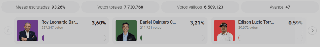 Frente por la Vida ha elegido a Roy Barreras como su candidato con 237 mil votos, representando el 3.60%. Su rival más cercano, Daniel Quintero, queda debajo por más de 26 mil votos.