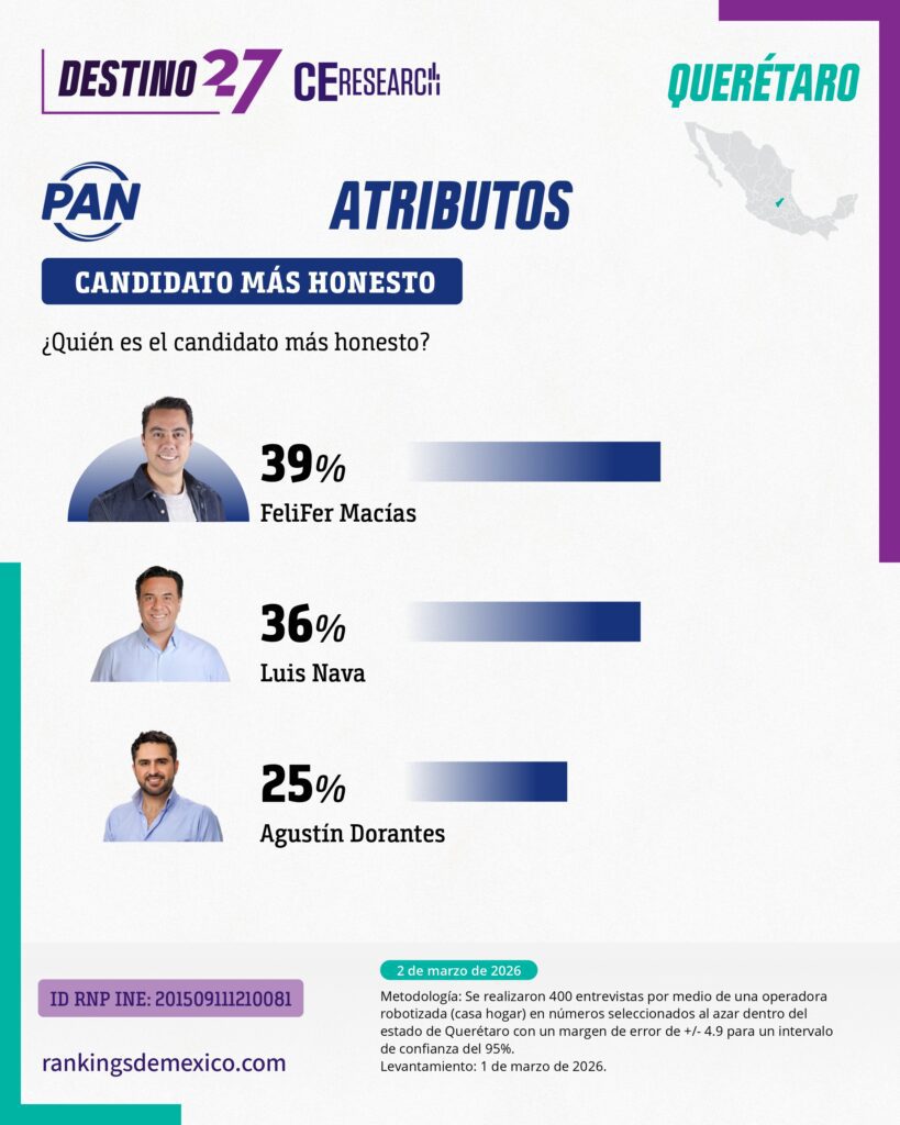 Además, si el PAN aplicara el método de Morena para elegir a sus candidatos -mediante una evaluación de atributos esenciales-, Macías resultaría ganador al dominar la opinión pública, que lo considera el más honesto (39%), más cercano a la gente (46%), mejor preparado (37%) y más capaz de liderar al estado (40%).