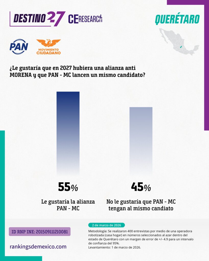 La preferencia por el alcalde se ve reflejada en los posibles escenarios de competencia, donde, tanto como candidato únicamente del PAN como de la coalición PAN-MC (por la que el 55% se manifestó a favor), superando en ambos casos por casi 10 puntos al candidato de Morena, Santiago Nieto.