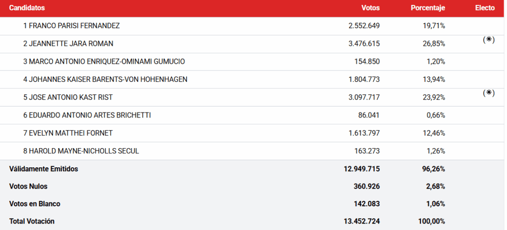 Jeannette Jara obtuvo el 26.85% de los votos, equivalente a 3 millones 476 mil 615, siendo 29 mil 761 de estos votos obtenidos del extranjero. Por su parte, José Antonio Kast alcanzó los 3 millones 97 mil 717 votos, equivalente al 23.92%, y de los cuales 10 mil 754 fueron del extranjero. Al no alcanzar ninguno la mayoría absoluta, se enfrentarán en la segunda vuelta el próximo domingo 14 de diciembre.