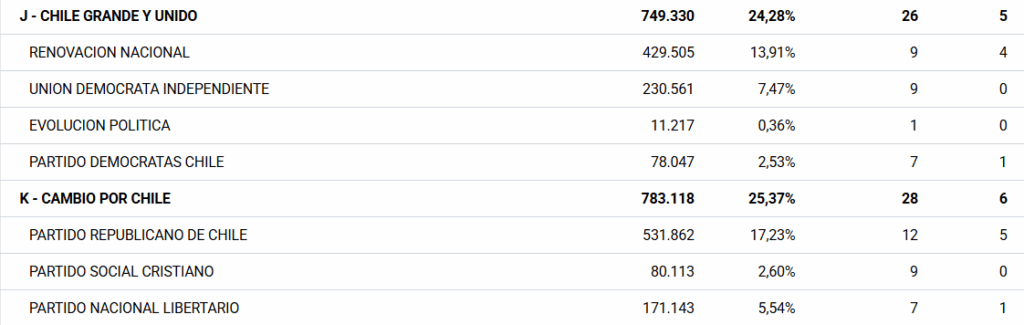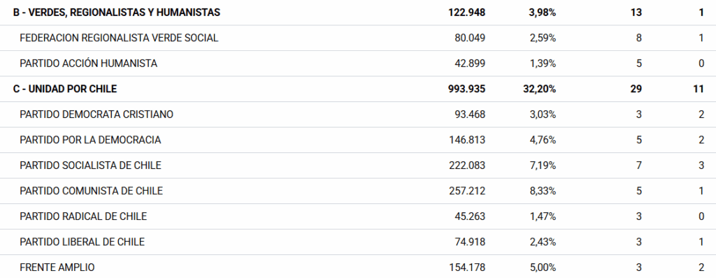 En cuanto a las elecciones parlamentarias, en el Senado el pacto oficialista Unidad por Chile logró 11 senadores (2 del Partido Demócrata Cristiano, 2 de Partido por la Democracia, 3 del Partido Socialista de Chile, 1 del Partido Comunista de Chile, 1 del Partido Liberal de Chile y 2 de Frente Amplio), Cambio por Chile 6 senadores (5 del Partido Republicano de Chile y 1 del Partido Nacional Libertario), 5 por Chile Grande y Unido (4 de Renovación Nacional y 1 de Partido Democratas Chile) y un único senador del pacto Verdes, Regionalistas Y Humanistas.