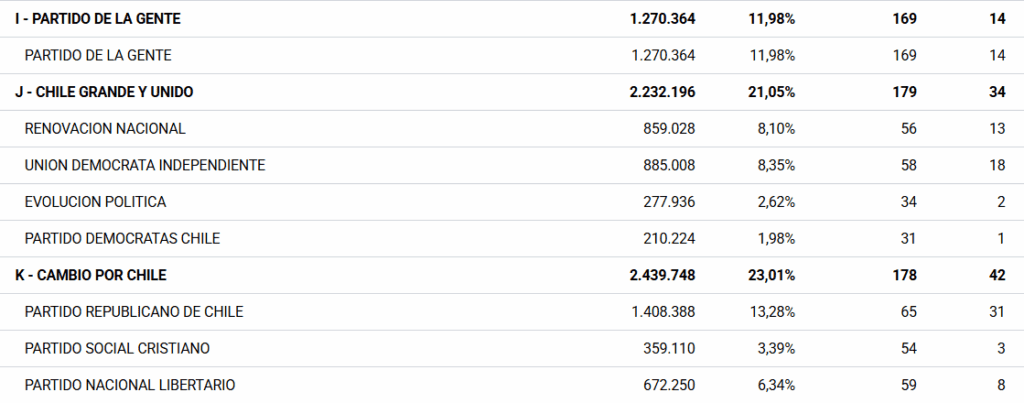 La sorpresa de estas elecciones fue Franco Parisi, líder del Partido de la Gente (PDG), que quedó en tercer lugar con 2 millones 552 mil 649 votos, equivalente al 19.71%. Diversos sondeos preveían que el derechista del Partido Nacional Libertario, Johannes Kaiser, y que la derechista tradicional y representante de Chile Vamos, Evelyn Matthei, obtendrían mayor respaldo.